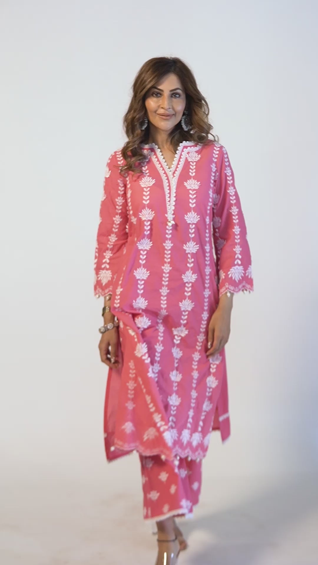 Mulmul Cotton Gene Fuchsia Kurta With Fern Pant White