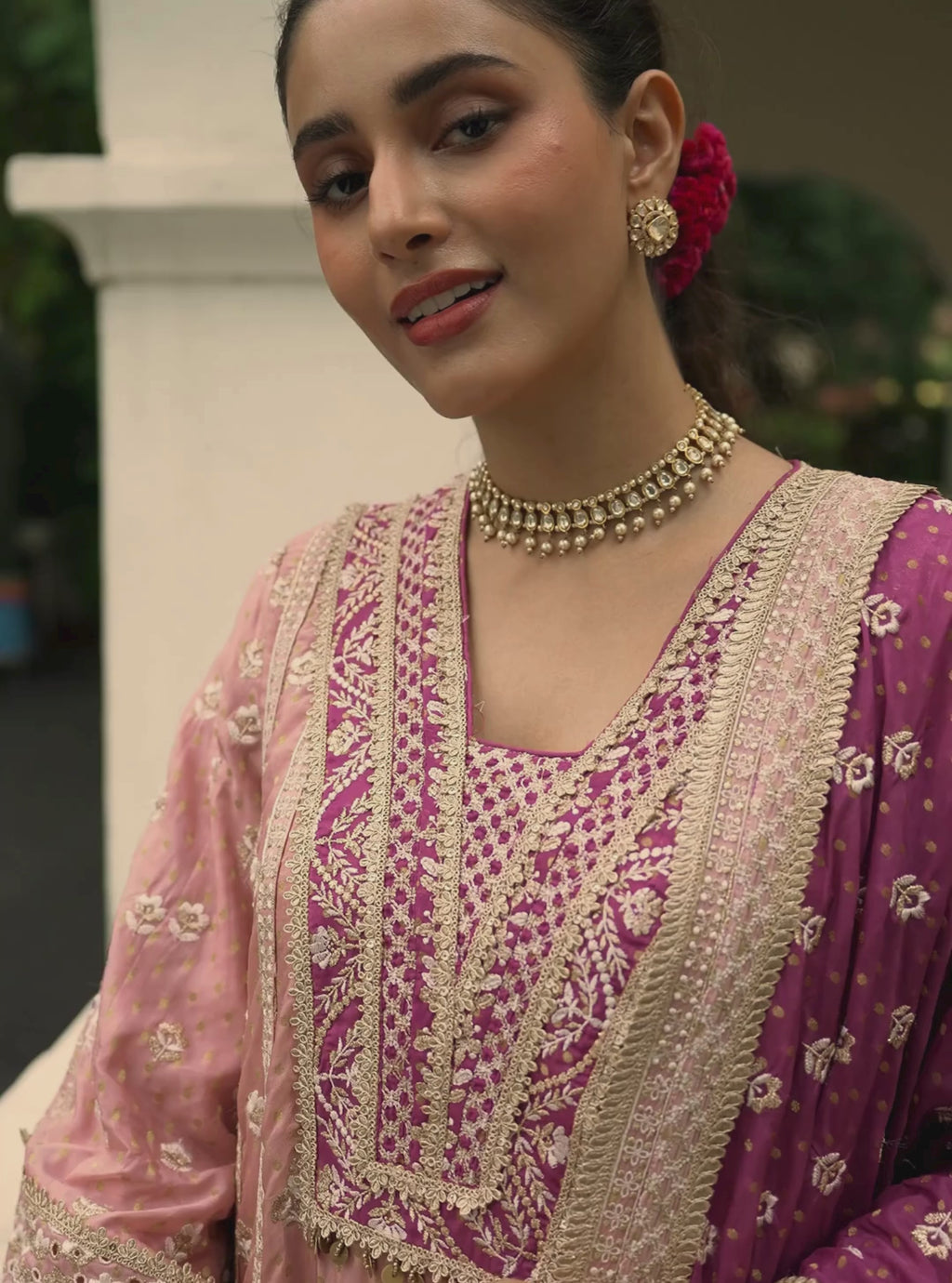 Mulmul Banarsi Bhumbro Lilac Anarkali Kurta with Mulmul Pima Satin Bhumbro Lilac Pant