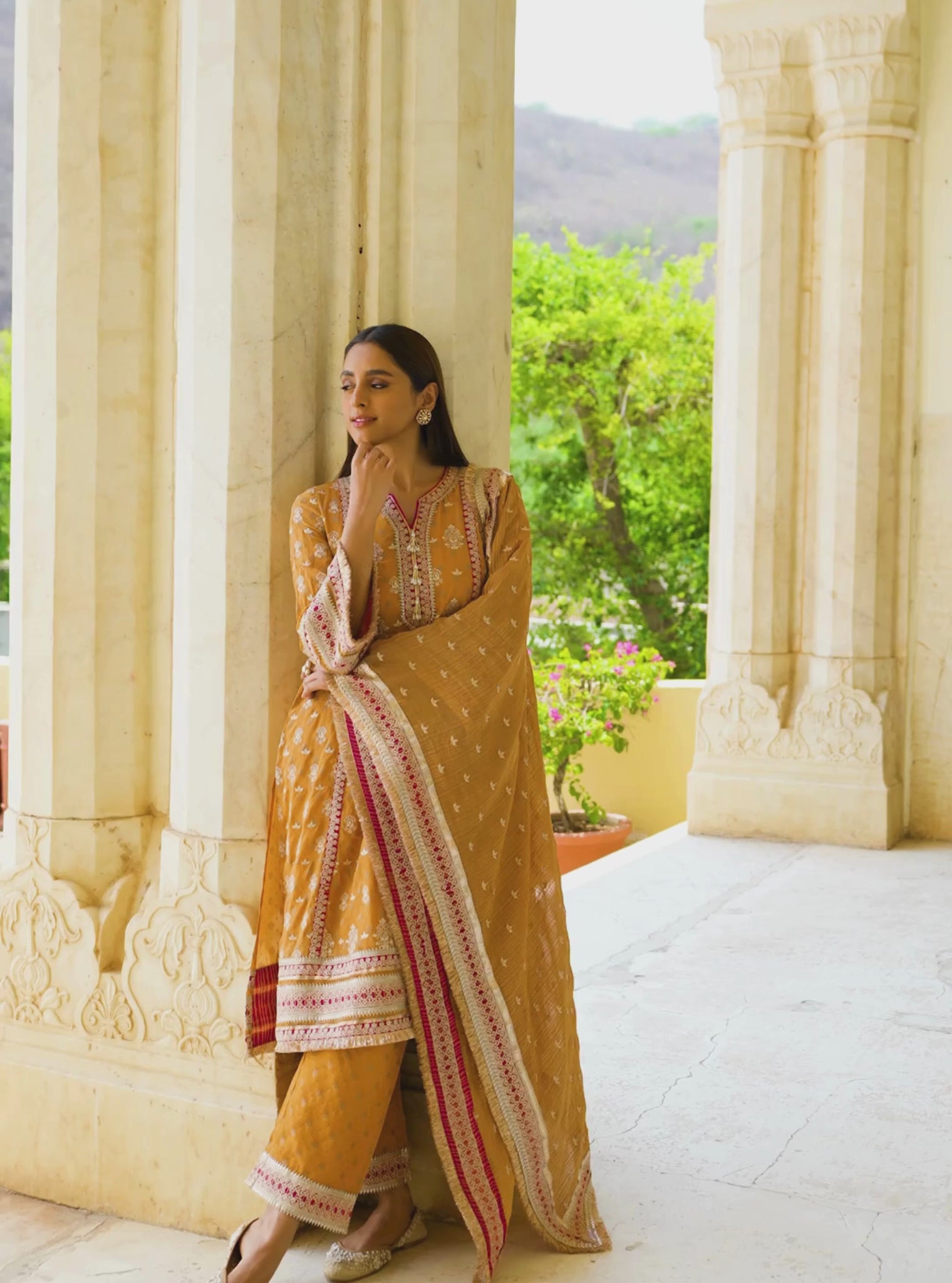 The Aryela Kurta Set Glows In A Vibrant Mustard Hue, Blending Festive Richness With Everyday Ease. Designed In A Straight Kurta Silhouette, It’S Crafted From Banarasi Fabric Woven With Intricate Zari Motifs That Bring A Soft, Elegant Shimmer To The Look. A Classic Round Neckline And Three-Quarter Sleeves Keep The Style Clean, Refined, And Timeless.
