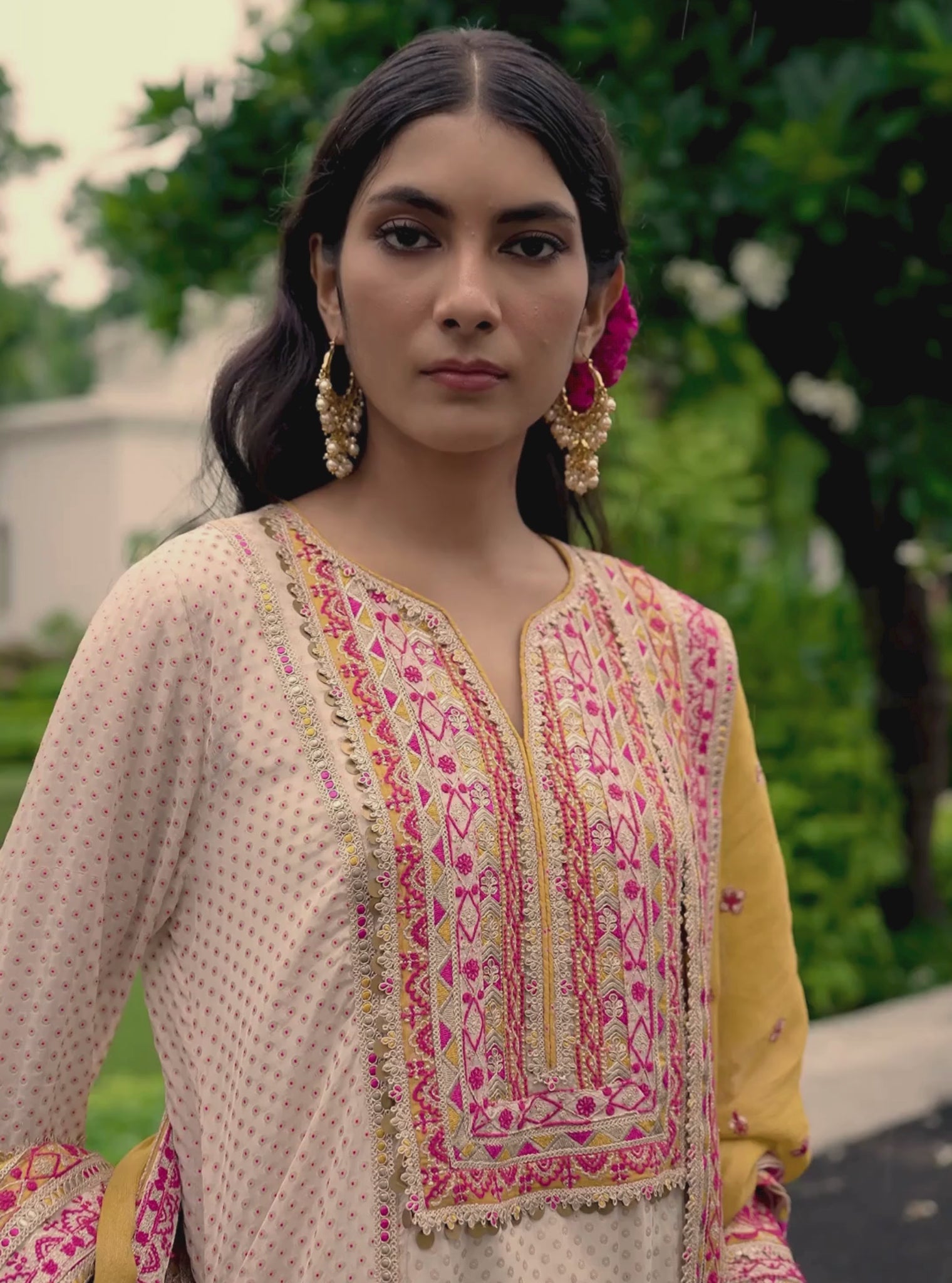 A celebration of heritage charm and vibrant contrast, this kurta set is designed for the modern festive wardrobe. The short, straight kurta in Banarsi coloured polka dot fabric carries a timeless appeal, its woven patterns reflecting artisanal finesse. Paired with tailored pima satin pants, the look is brought to life by an off-white lurex-insert dupatta in a warm mustard hue, finished with a subtle sheen that catches the light. The harmonious blend of texture and color makes this ensemble a versatile choice for pre-wedding festivities, cultural gatherings, and intimate celebrations where tradition meets contemporary style.