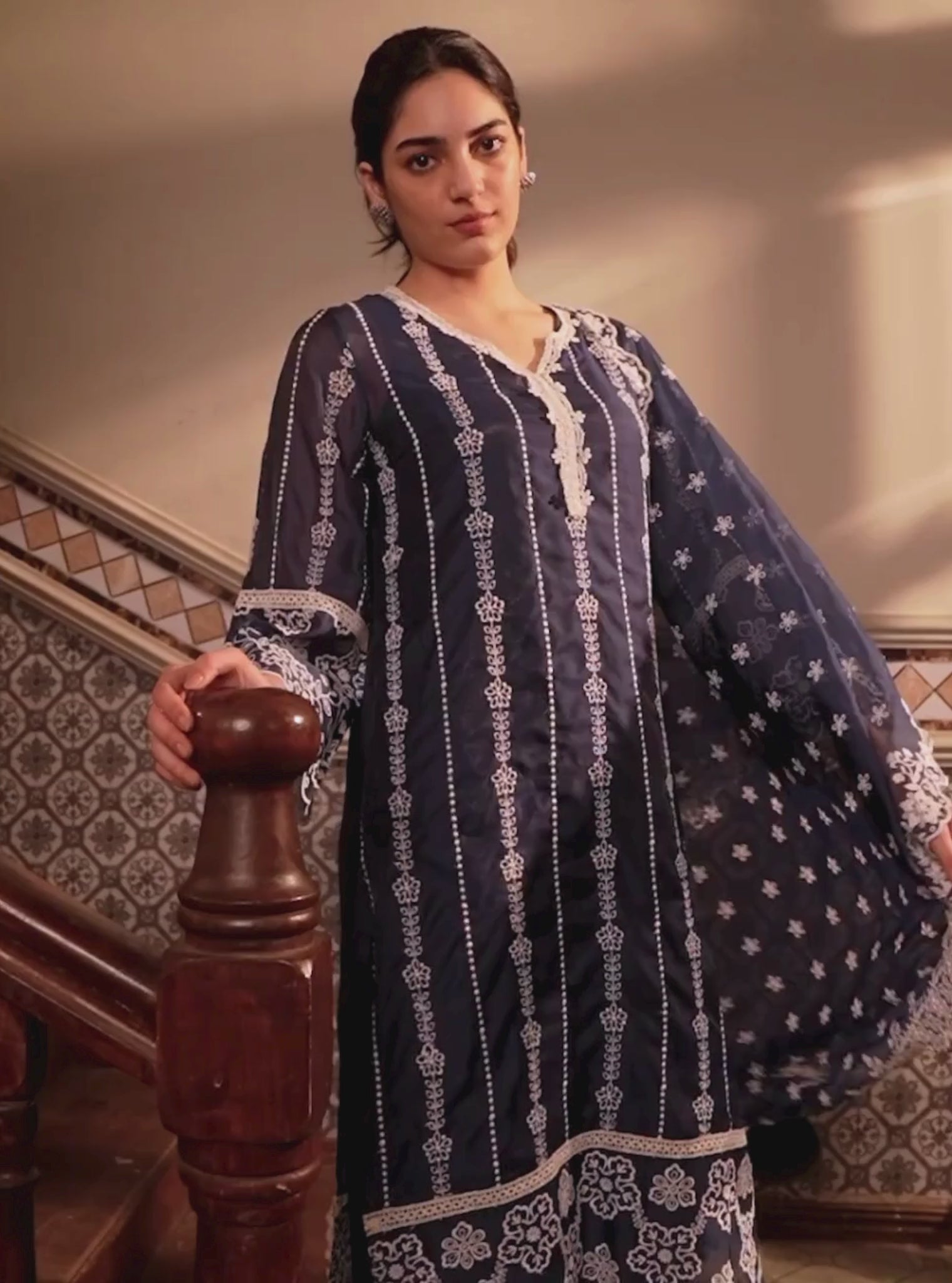 Elevate your summer evening attire with this exquisite navy kurta set. Crafted to perfection, this ensemble exudes sophistication and charm. The kurta boasts intricate white lace detailing along the neckline, adding a touch of elegance. Delicate vertical embroidery graces the entire length of the kurta, enhancing its allure. The hemline is adorned with striking embroidered floral motifs, creating a scalloped edge that exudes femininity. The straight pants featuring a matching scalloped hemline, complete the ensemble with finesse.