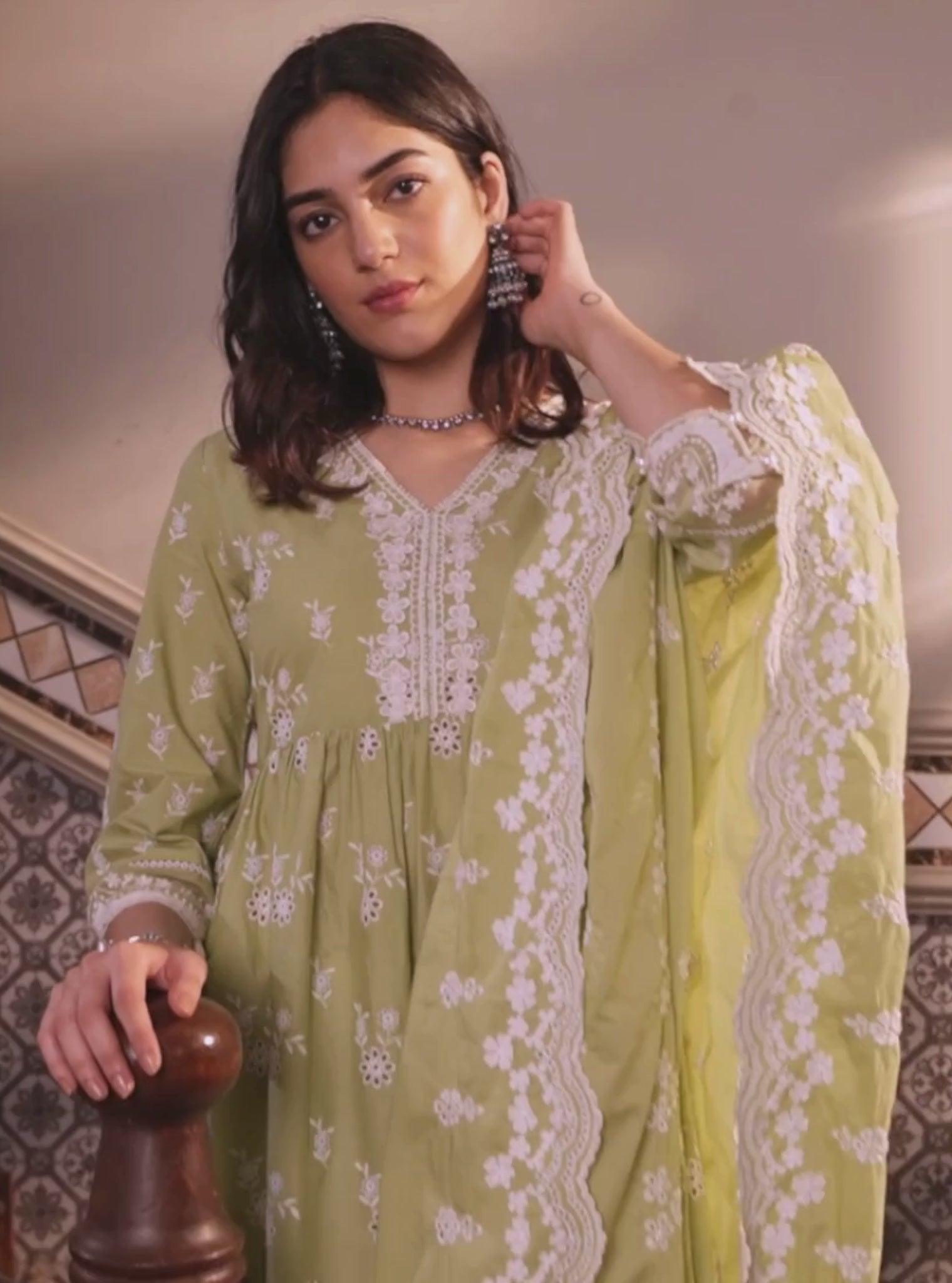 Elevate your summer attire with this captivating cotton Anarkali in a vibrant green shade. Its playful charm is evident in every detail, making it a delightful addition to your wardrobe. The kurta flaunts a flattering V-neckline embellished with intricate lacework, while the entirety of the fabric is adorned with dainty floral motif embroidery in contrasting white thread. Delicately scalloped hemlines and sleeves add a touch of elegance to the ensemble. For a chic look, pair it with white bottoms to highlight the exquisite white embroidery.