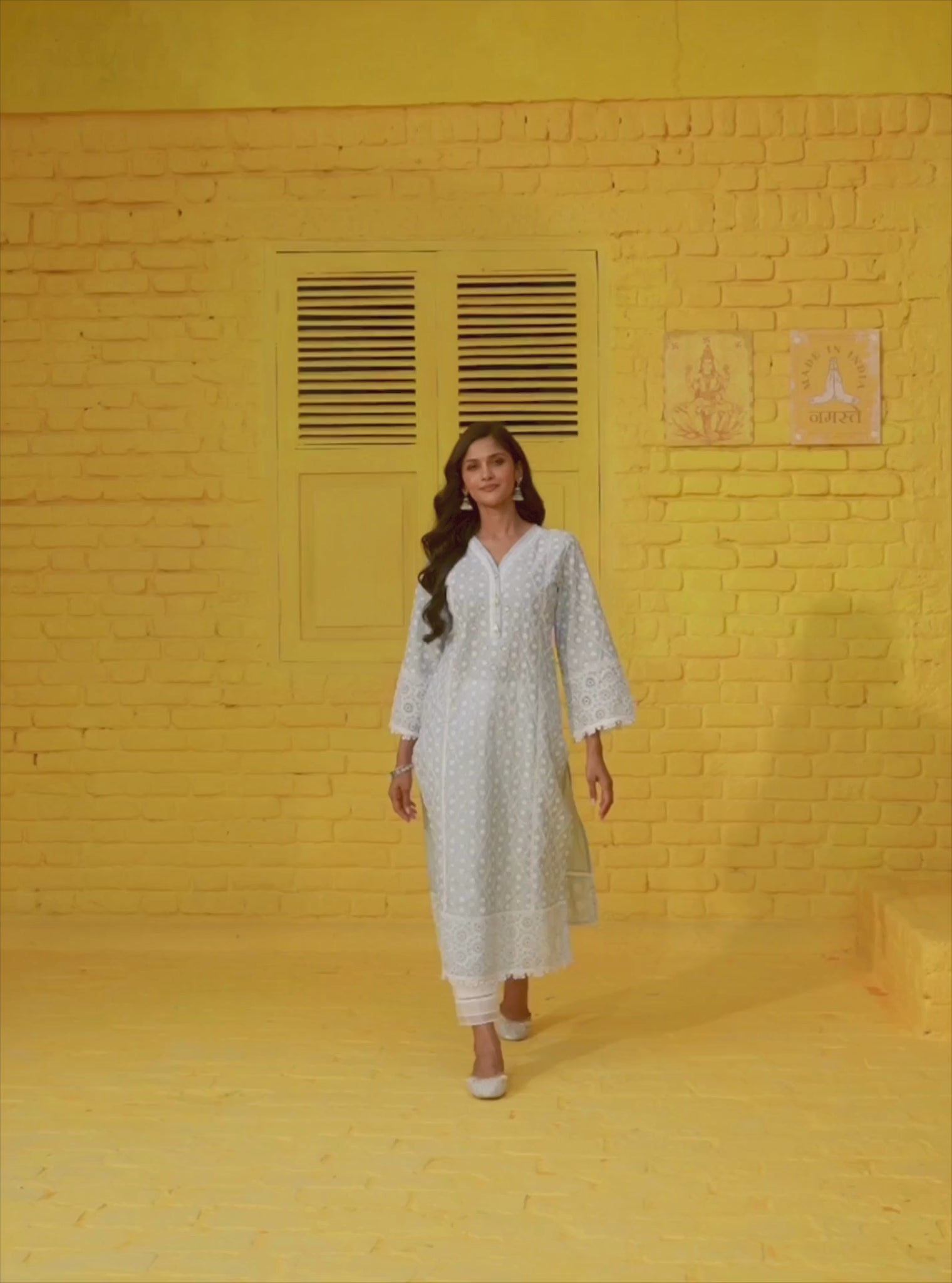 A versatile ensemble in serene blue, elevated with delicate cut-work details all over, accentuated with white thread embroidery, that creates a subtle contrast. The kurta features a classy V-neckline; the sleeves and the hemline are adorned with lace trimmings for the quintessential Mulmul touch.?ÿ