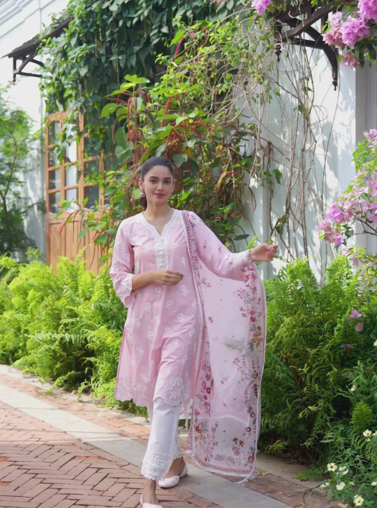 Light and timeless, the Avo kurta set is crafted in soft Supima cotton for breathable comfort. The straight kurta features delicate printed motifs and subtle detailing that lend the silhouette a refined charm. It is paired with easy cotton pants that offer structure while remaining comfortable. The ensemble is finished with a sheer organza dupatta featuring coordinated Avo prints that add softness and movement. A versatile set suited for everyday elegance and relaxed festive dressing.