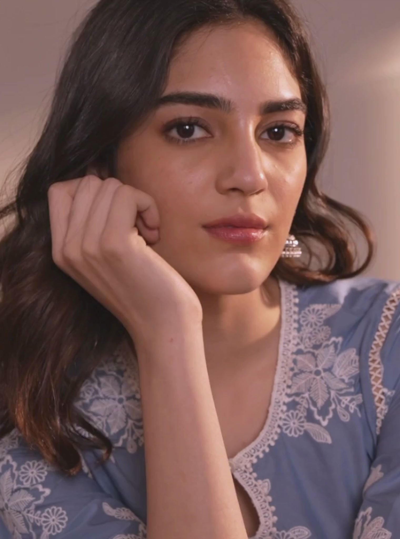 Completing the ensemble is a matching blue dupatta, meticulously adorned with intricate white thread embroidery and lace edges, adding an ethereal touch to your outfit.