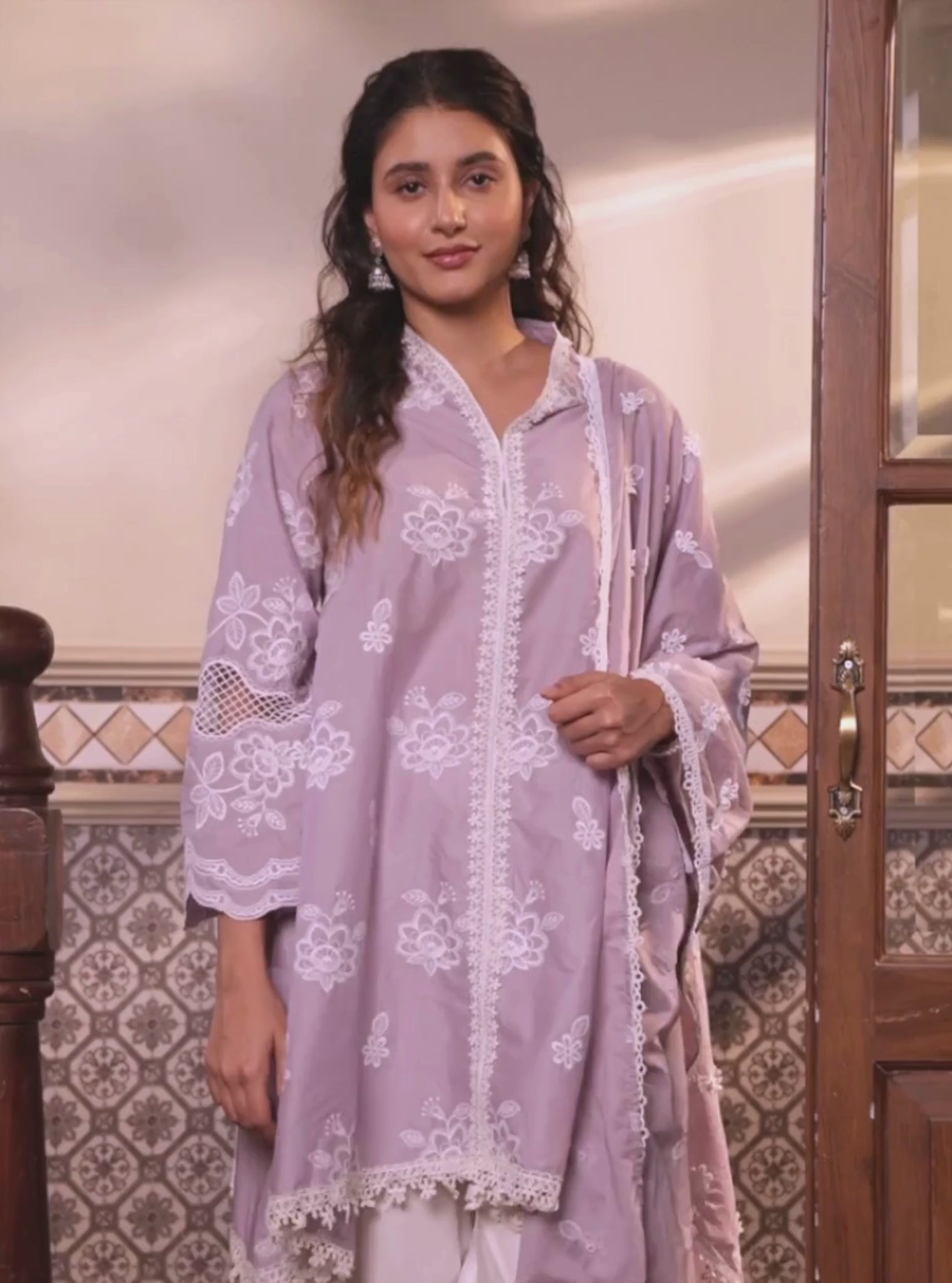Complete the look by pairing it with white pants and accessorizing with the matching lavender dupatta, adorned with lace trimmings and exquisite 3D embroidery.