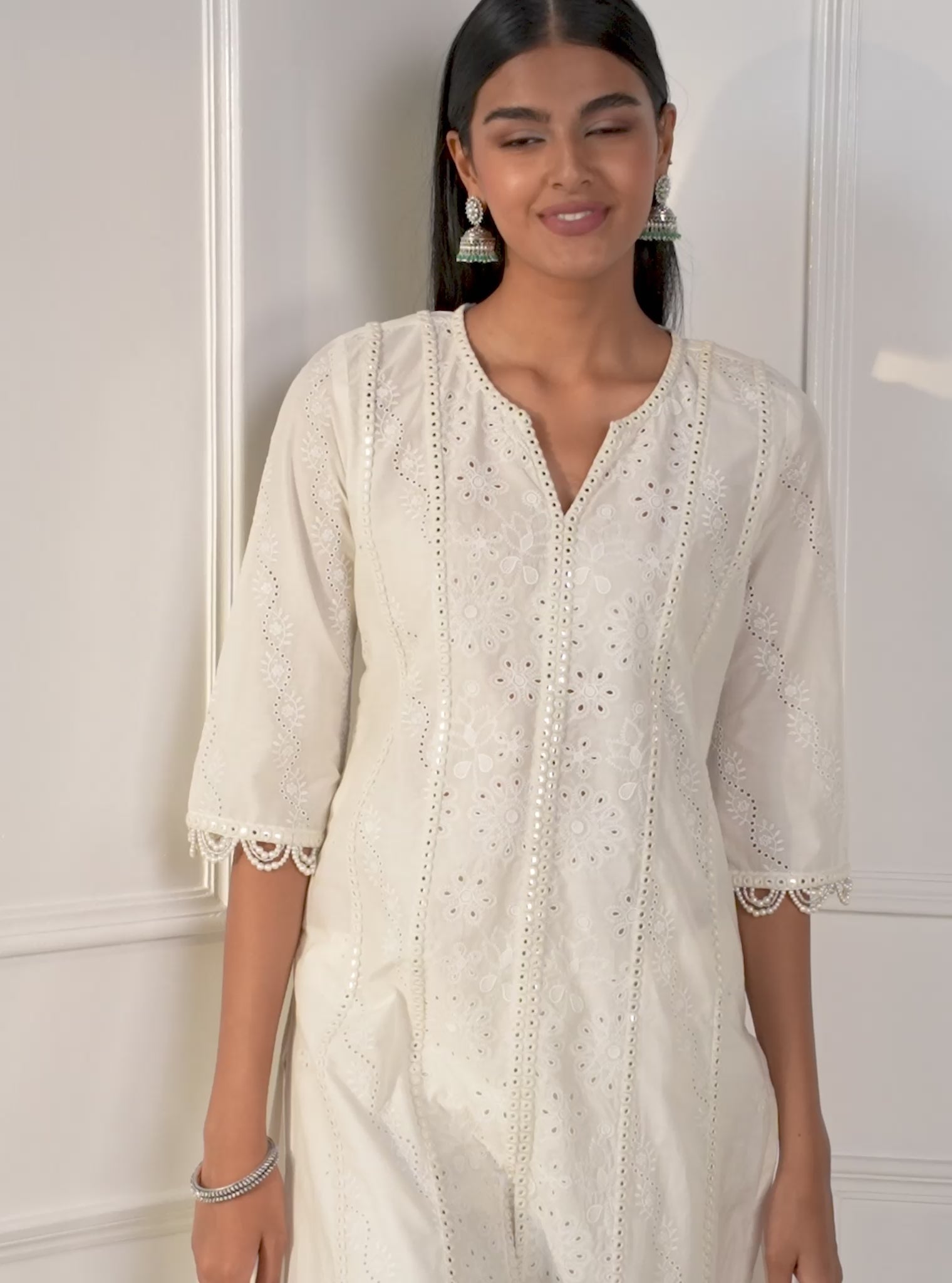 The cara kurta has minimal lace trims through the lengths of the kurta separating it into panels of running floral eyelet embroidery and abs diagonal needlework adding the perfect balance of a transitional outfit from a casual lunch to an evening party! Not to miss out on the delicate lace borders that complete the hemlines and sleeves.