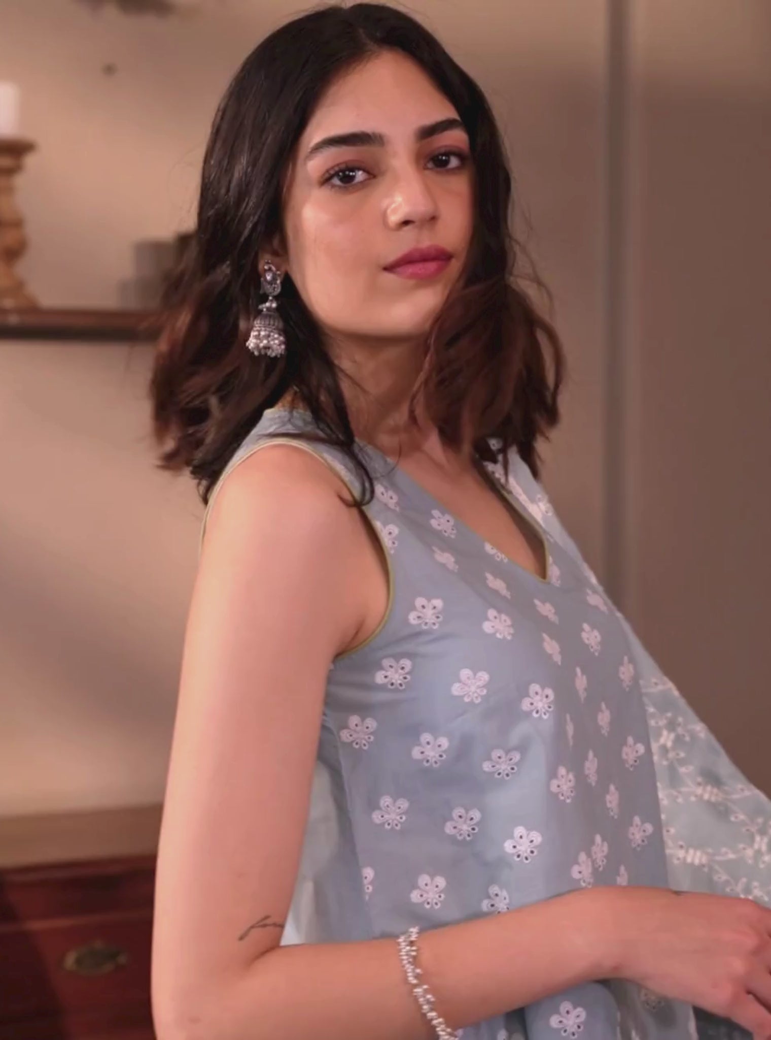 Introducing a lively and contemporary ensemble, this sleeveless Anarkali kurta paired with slim-fit pants promises a refreshing addition to your summer wardrobe. Embracing a playful silhouette, the breezy V-neck design ensures comfort and style in equal measure, making it a must-have among your seasonal favorites. The delicate blue hue is adorned with contrasting white thread embroidery, adding a touch of elegance to the ensemble.