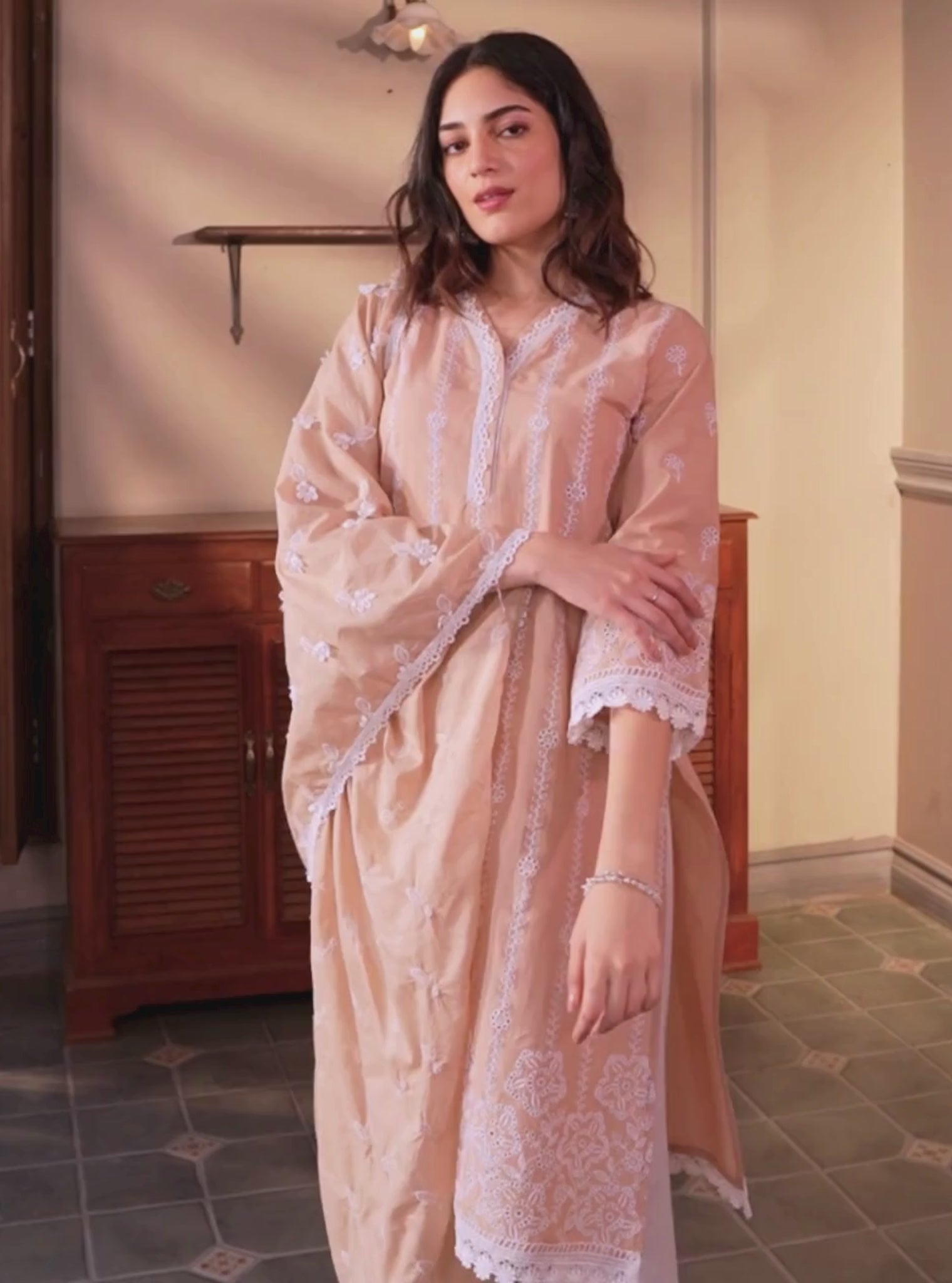 The sophisticated beigeensemble is adorned with white thread embroidery throughout. The intricate white lace trimming along the neckline and hemline infuses a feminine charm into the attire. The kurta features vertical line embroidery, enhancing its grace, while the scalloped lace edges on the sleeves and hemline add a graceful finish.