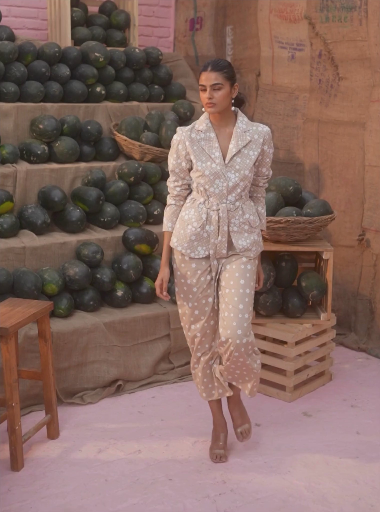An elegant and professional ensemble comprising a 3-piece set. The waistcoat and jacket feature the same jaali embroidery with floral details, The bottoms are cropped with floral embroidery. Wear the pieces together to create a polished ensemble, fit for the workplace, or wear the pieces separately to create an array of different looks, fit for work or a party!