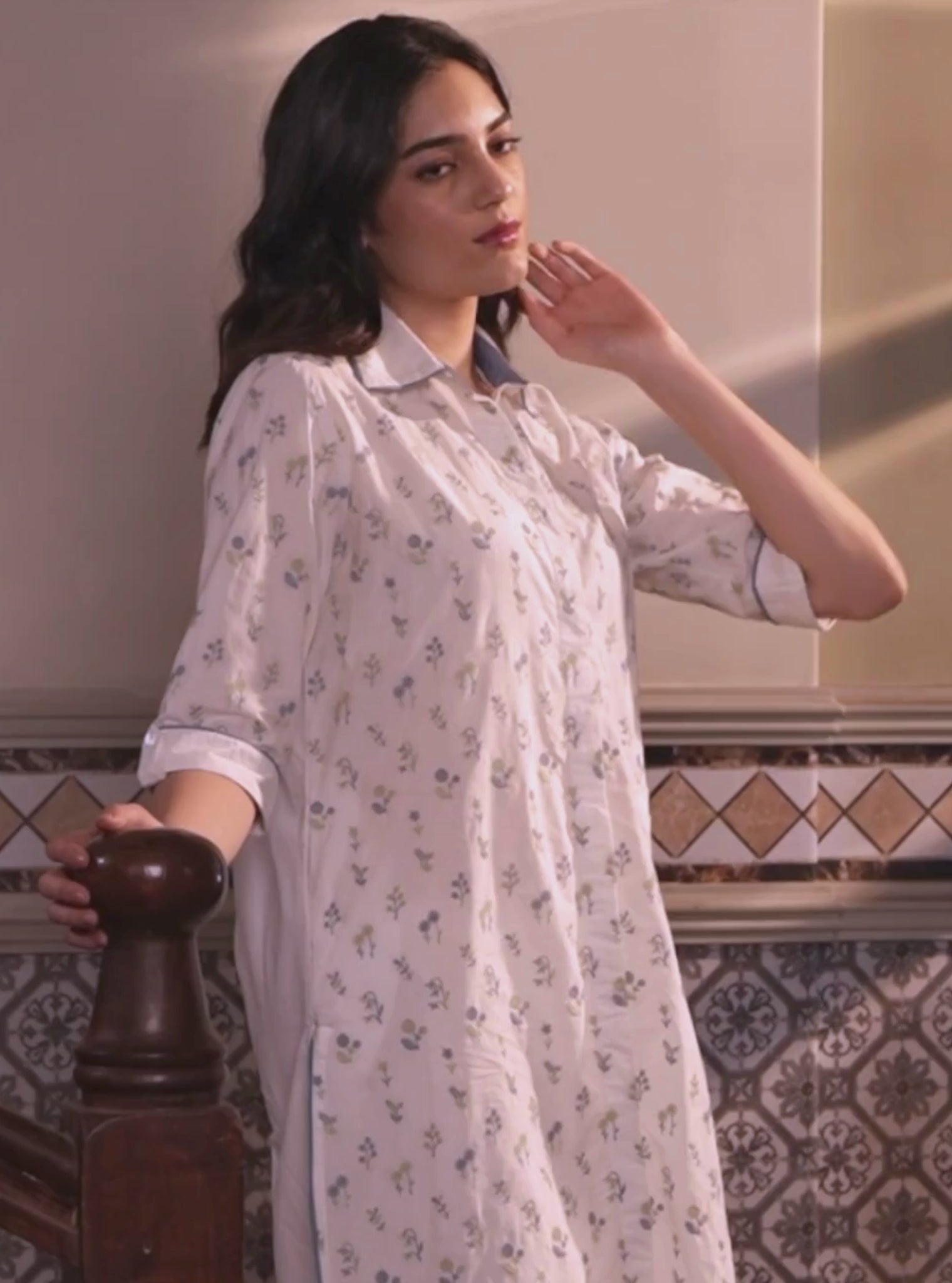 Introducing a contemporary take on the classic kurta silhouette, this sophisticated garment combines timeless elegance with modern flair. The collared neckline and cuffed half-sleeves exude professionalism, making it an ideal choice for infusing a corporate formality into your attire. Adorned with intricate floral embroidery and accented with refined dark blue piping along the hemline, this kurta epitomizes corporate chic the desi way!