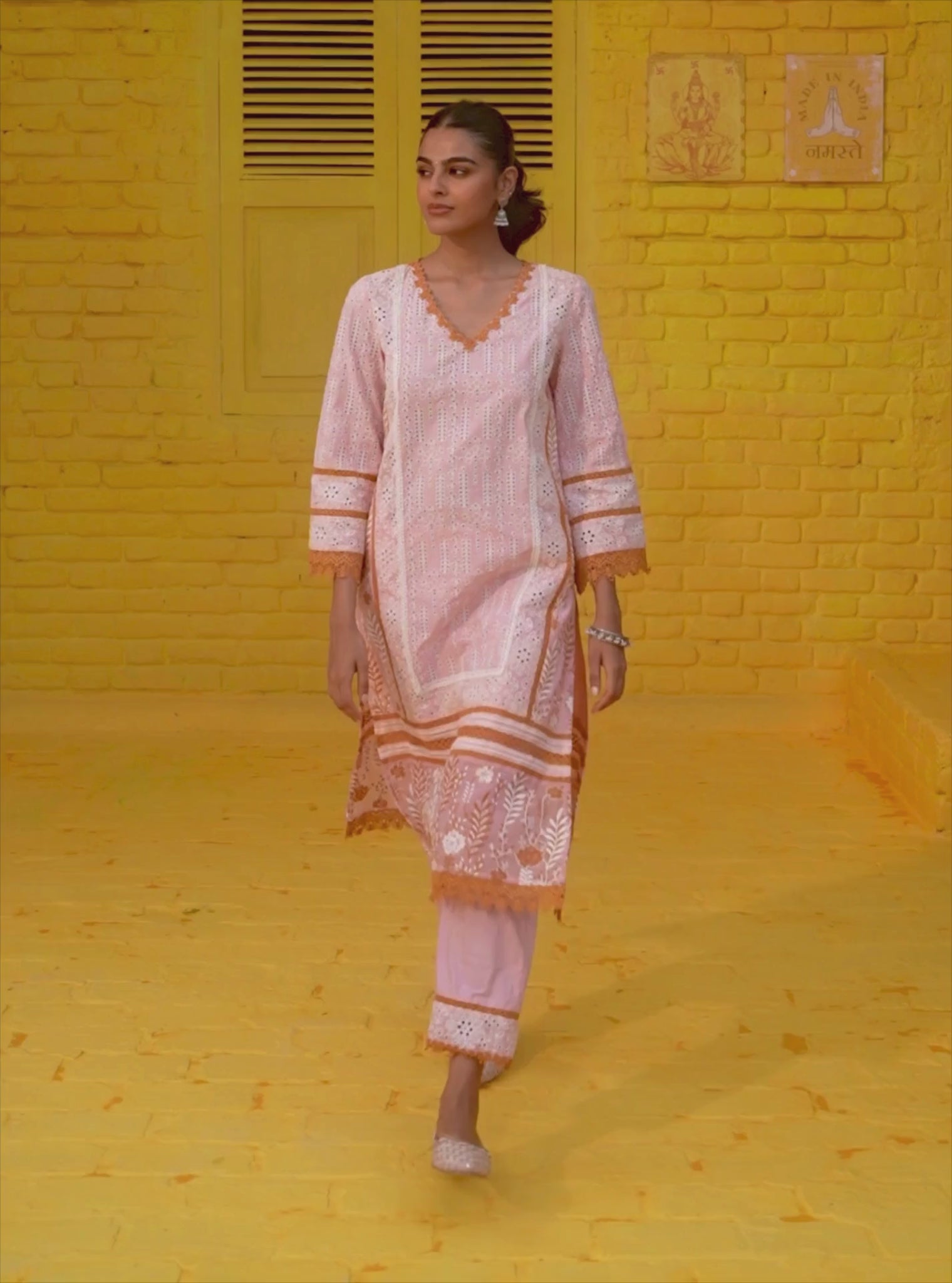 Embrace the vibrant hues of spring with this enchanting kurta set - a perfect blend of tradition and contemporary style. The soft pastel pink kurta is adorned with intricate white lace embroidery, creating a delicate and feminine look that's perfect for any occasion. The V-neckline, sleeves, and hemline are tastefully detailed with a touch of lace, adding a hint of luxury and elegance. The trousers feature a coordinated lace trim at the cuffs, maintaining the outfit's cohesive and elegant look.?ÿ