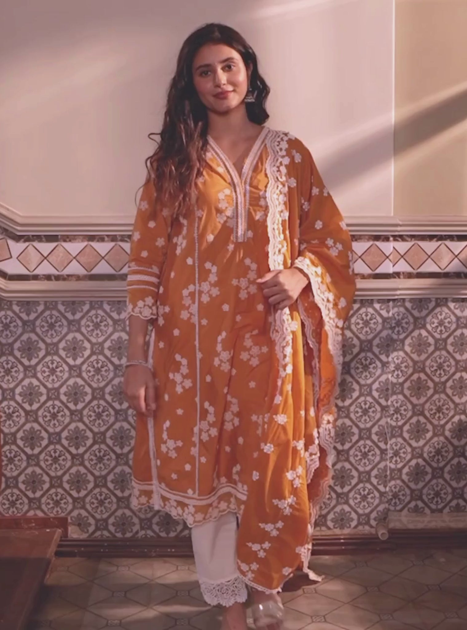 Infuse your summer collection with a vibrant touch by adding this stunning orange kurta, tailor-made for sun-drenched days. Crafted with a chic Y neckline embellished with intricate lace detailing, this kurta exudes elegance. Adorned with delicate flower motifs arranged in charming patches, its scalloped sleeves and hemline add a touch of grace. Pair it effortlessly with white bottoms to accentuate the exquisite embroidery. Complete the ensemble with a matching orange dupatta, echoing the scalloped hem and floral intricacies for a sophisticated finish.
