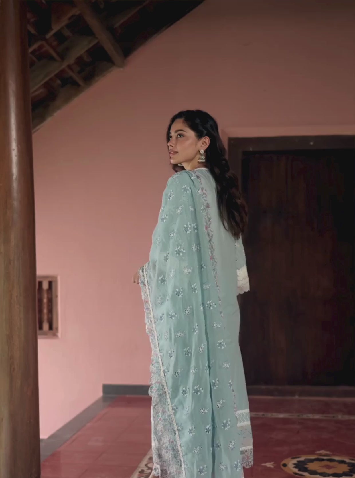 The matching straight-fit pants and the sheer dupatta, graced with subtle floral patterns and scalloped lace borders, completes the ensemble. Ideal for daytime gatherings or festive occasions, this kurta set captures the essence of understated luxury and effortless style.
