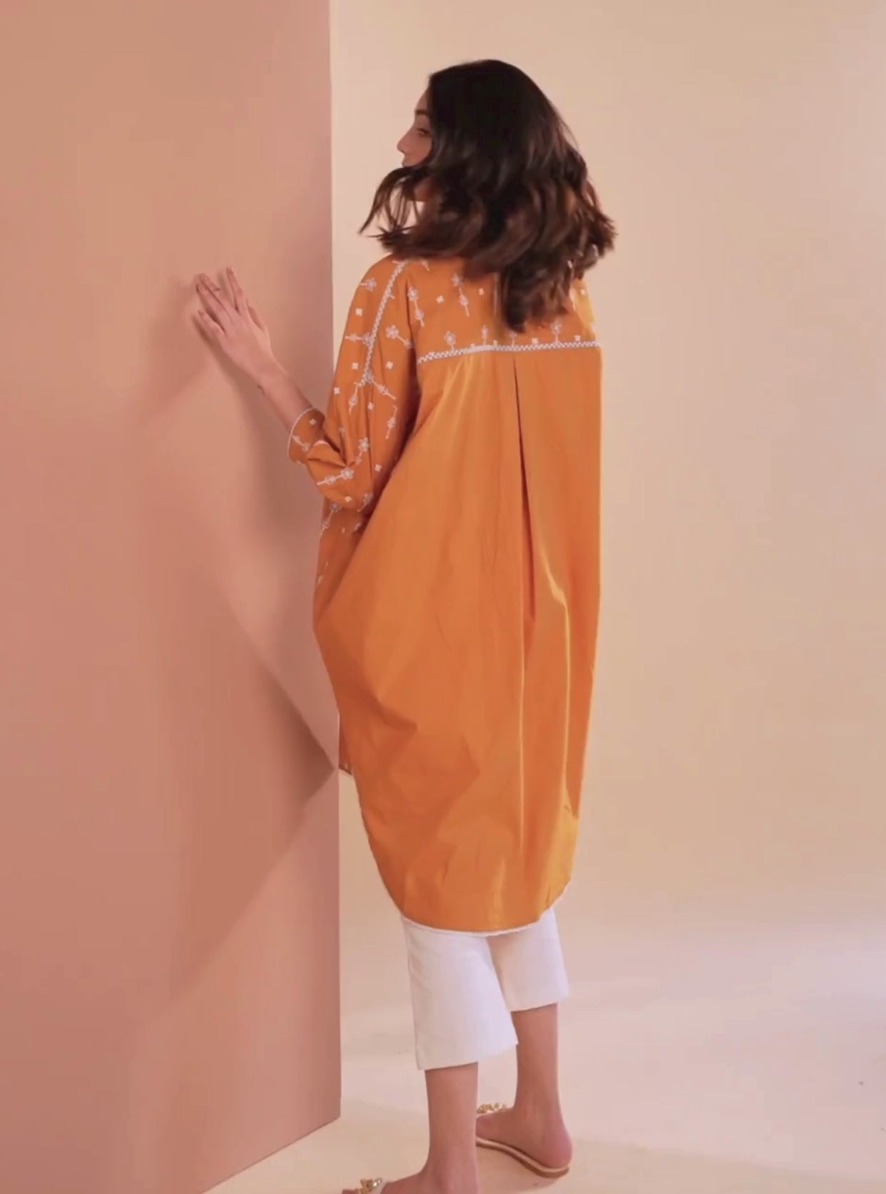 This exquisite orange ensemble seamlessly blends Indo-Western aesthetics. The kaftan-inspired top boasts drop shoulders and is adorned with intricate white embroidery, creating a captivating contrast. Elevating the sophistication, the Mandarin-style neckline adds a refined touch to the outfit. It is an ideal choice to stand out at evening gatherings as the focal point of attention.