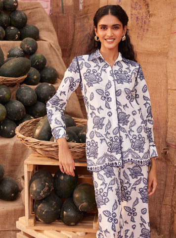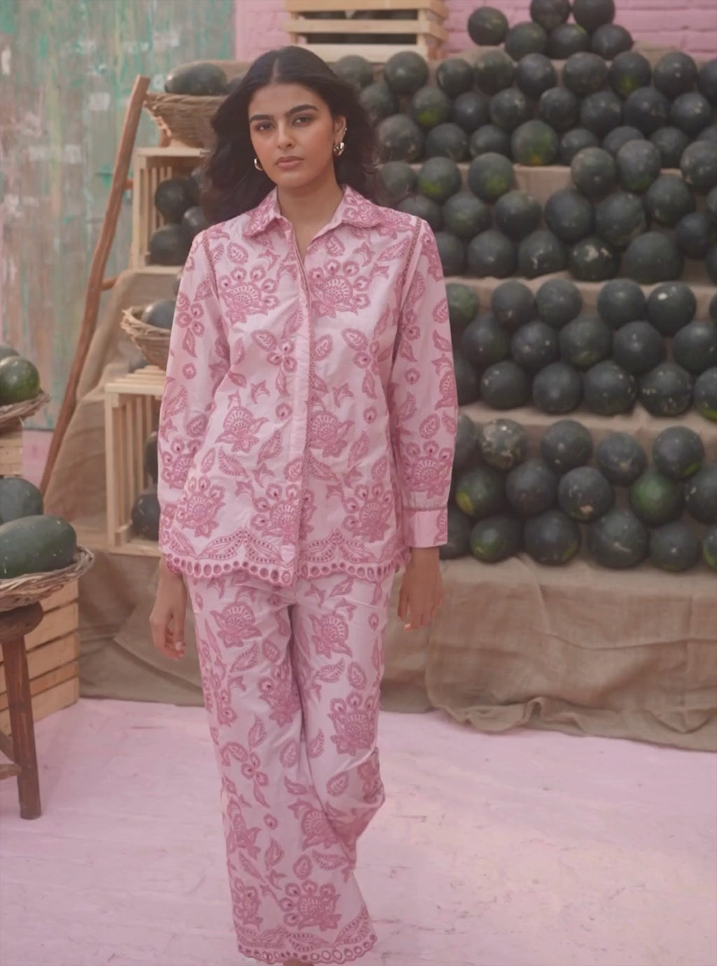 This Elegant Co-Ord Set Features A Light Pink Base Adorned With Intricate Pink Floral And Paisley Embroidery. The Top Is A Button-Down Shirt With Long Sleeves And A Delicate Scalloped Hemline. The Matching Straight-Leg Trousers Are Embroidered With The Same Elegant Design, Complete With Scalloped Edges At The Hem. The Ensemble Combines Traditional Craftsmanship With A Contemporary Silhouette, Perfect For A Stylish And Comfortable Look.