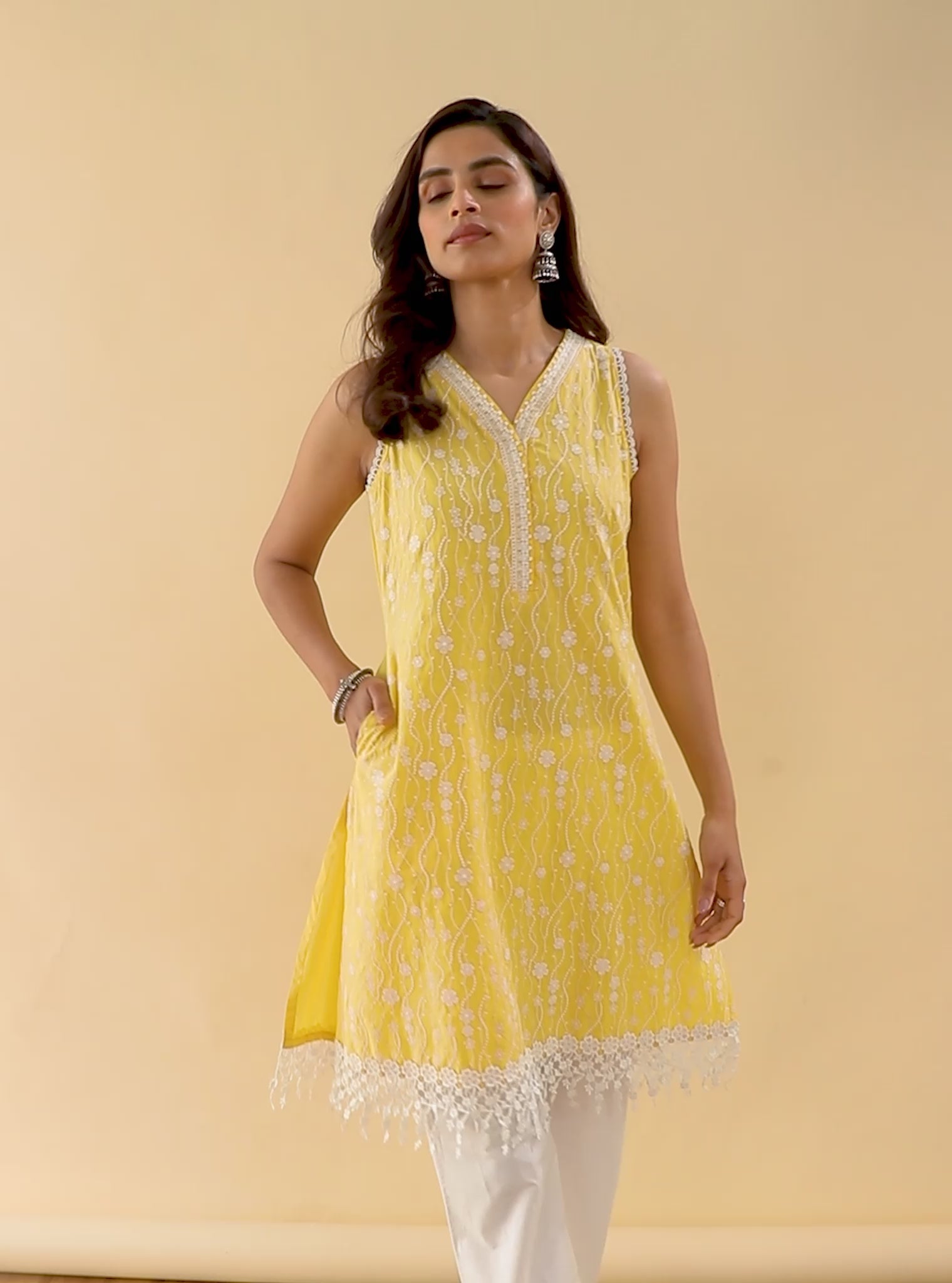 The sleeveless straight fit Seoni kurta in summer yellow is made from 100% Mulmul cotton, featuring rhythmic floral embroidery and fine cutwork cotton lace on the hemline. The kurta is paired with cutwork cotton straight pants to complement the overall look.
