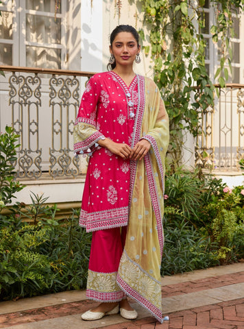 Soft, graceful and effortlessly elegant, the Seya kurta set is crafted in Supima cotton for breathable comfort. The straight blue kurta features delicate printed motifs and subtle detailing that frame the silhouette beautifully. Paired with comfortable cotton pants, the ensemble is finished with a sheer organza dupatta adorned with coordinated Seya prints. Light and versatile, this set transitions seamlessly from daytime occasions to intimate evening gatherings.
