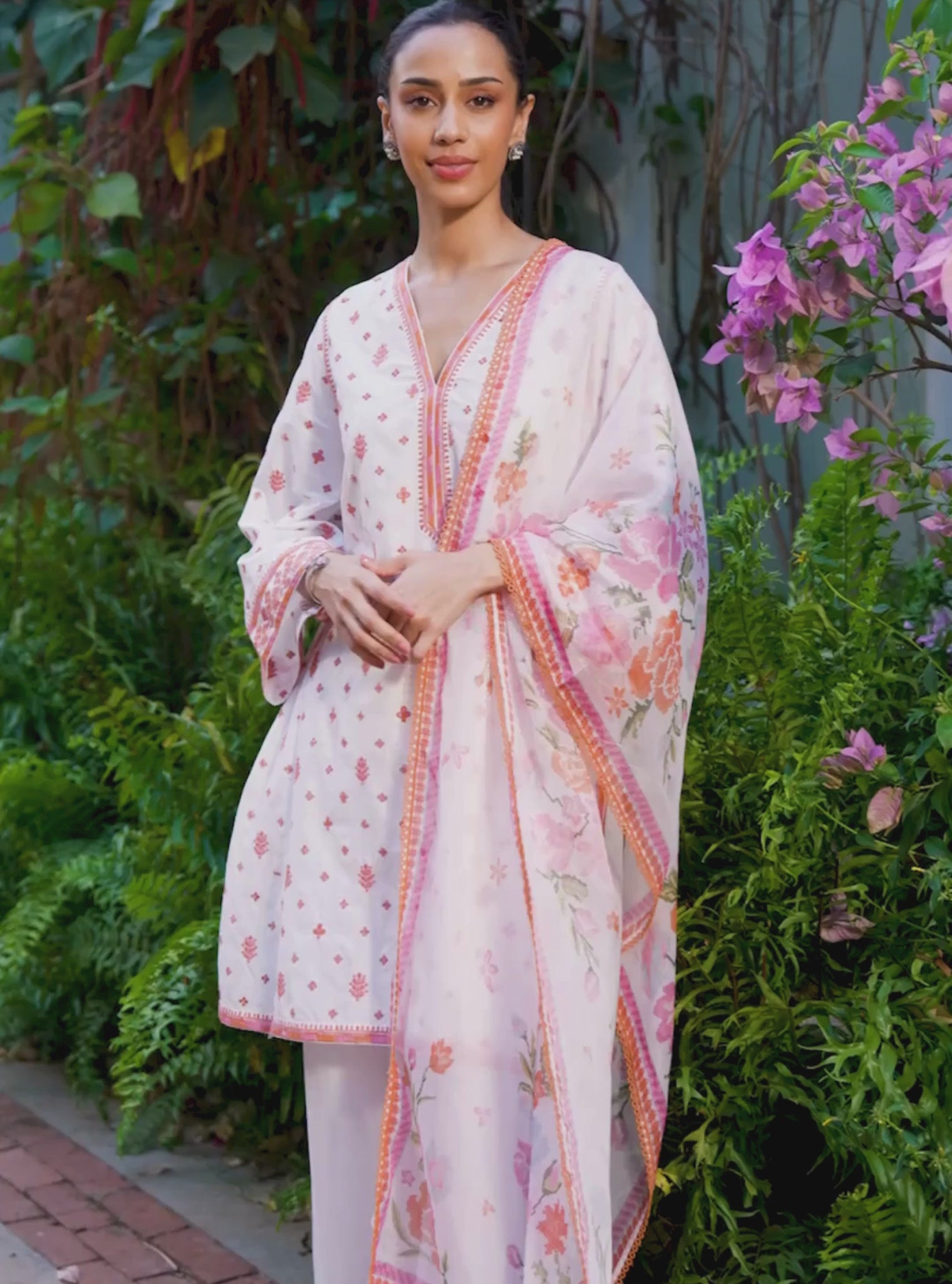 Light, airy and designed for everyday elegance, the Vysa kurta set is crafted in breathable Supima cotton that feels soft and comfortable through the day. The kurta features delicate printed motifs and subtle detailing along the neckline and sleeves, giving the silhouette a refined yet effortless feel. It is paired with cotton pants that offer ease of movement. The look is completed with a sheer organza dupatta featuring coordinated Vysa prints that add a soft, flowing finish. Perfect for warm days, daytime gatherings and relaxed festive moments.