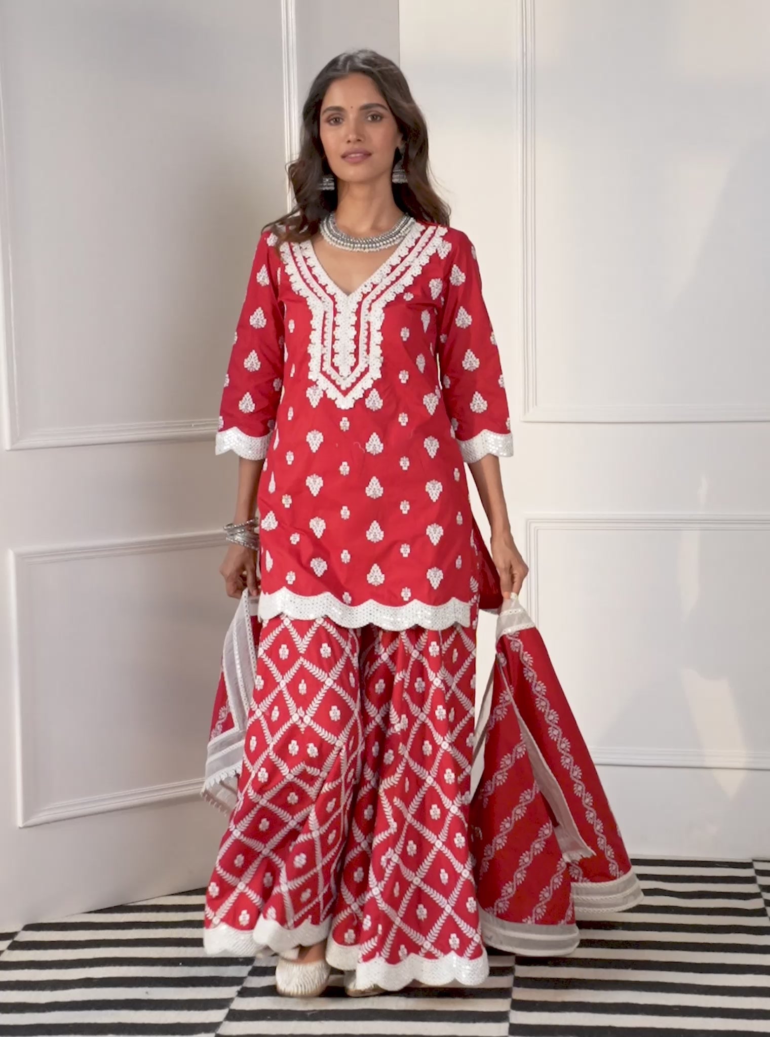 Weddings upcoming? Be a stunner in the guest list with the zoriana set! The short straight kurta has white motifs that draw eyes and is finished with scalloped hems and multiple lace trims on the neckline adding to its grandeur. Paired with roomy palazzos of the same colour, the bottom is made with smaller motifs placed closer together adding character to the look!