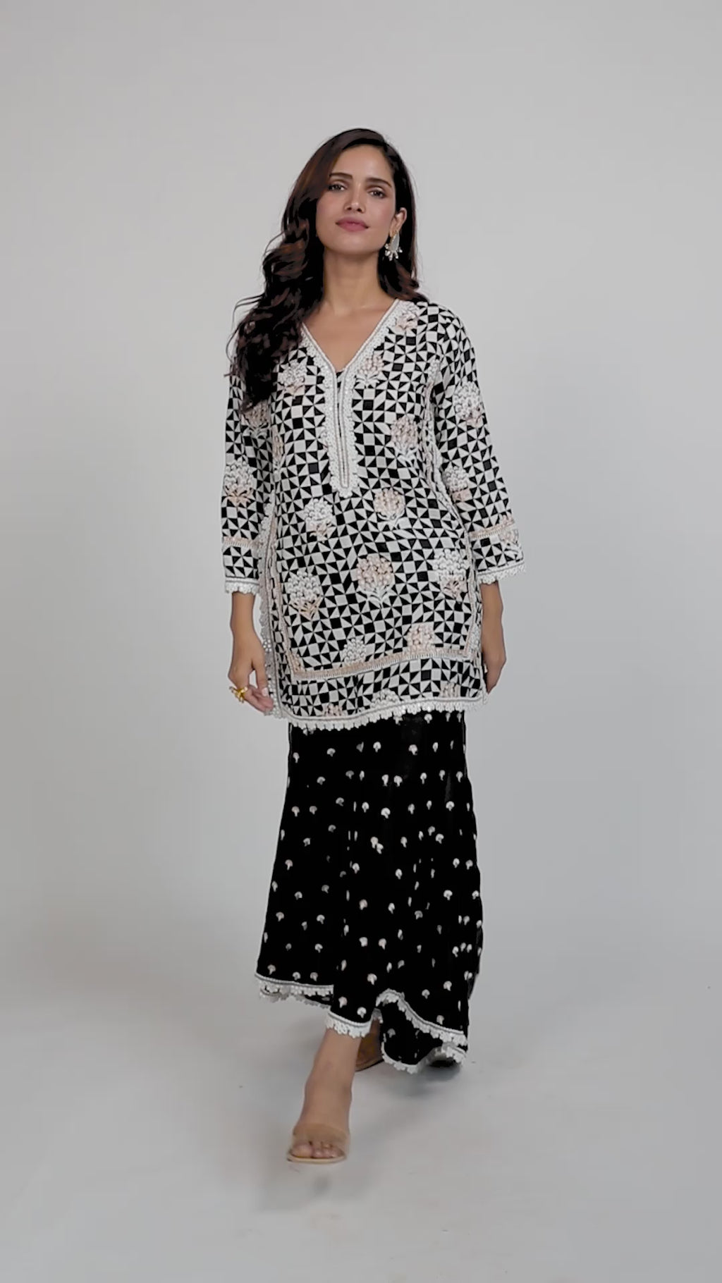 Overall Kaleidoscope Print With Floral Motif Embroidery In Panels