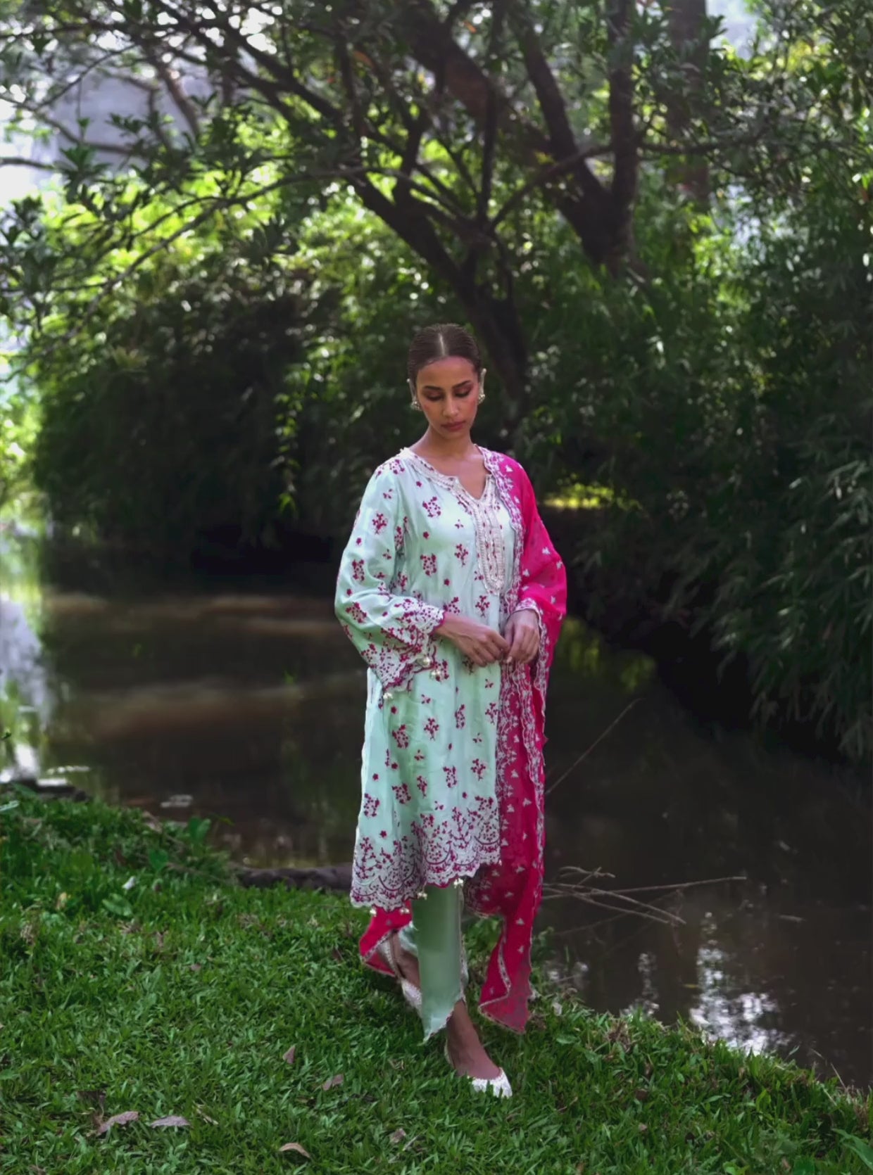 Delicate and dreamy, this pastel-green kurta set captures the essence of playful elegance. The kurta features contrasting pink embroidery along the neckline, hem, and sleeves, The scalloped edges on the bell sleeves add a playful yet elegant touch. Paired with a bright pink embroidered dupatta, this ensemble creates a harmonious contrast, making it ideal for festive occasions or intimate gatherings.