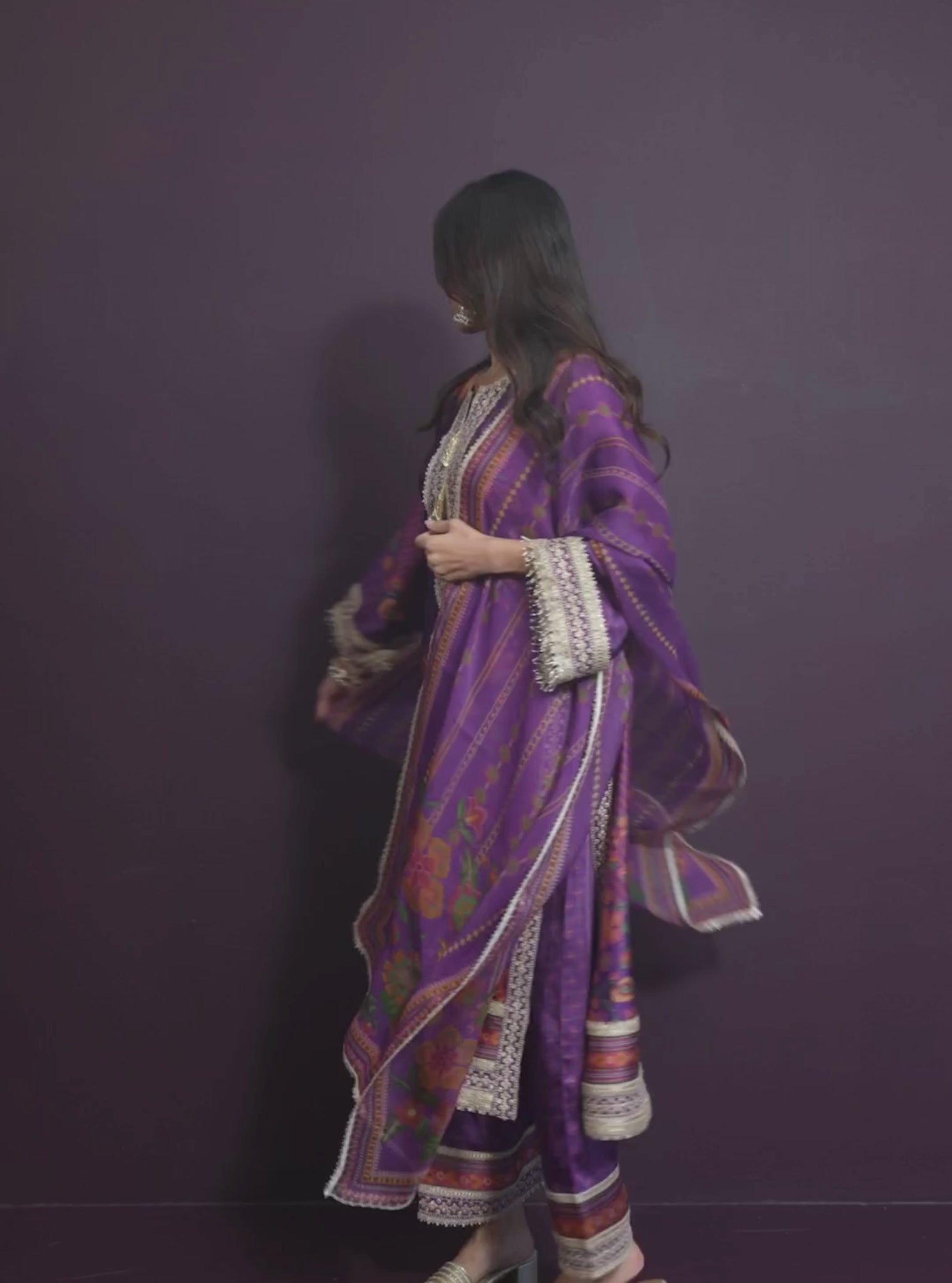 "A purple printed kurta in cupro satin, styled with matching pants and an organza dupatta. Effortless and graceful for festive wear."