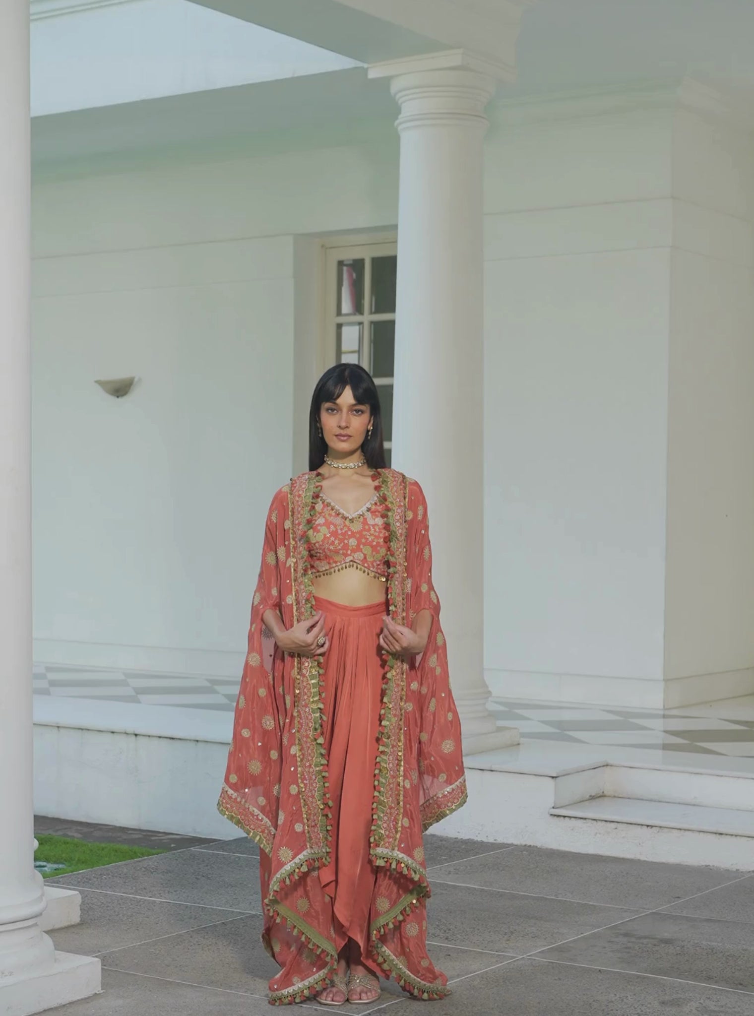 For moments that call for a pop of color, this vibrant orange cape set makes a striking statement. The airy viscose glass organza shrug drapes over a cupro satin blouse and skirt, adorned with intricate Adda work that lends an artisanal touch. Radiant yet refined, it’s an ensemble that brings warmth and charm to any festive celebration.