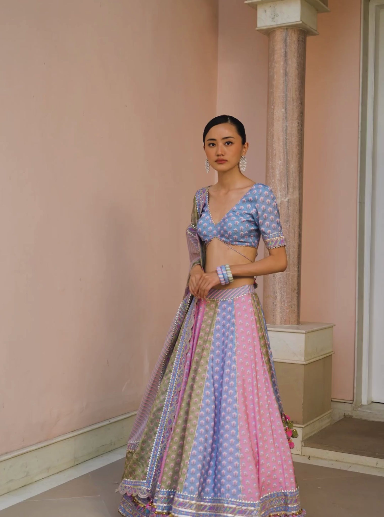 The Indira Lehenga In Blue Uses Vibrant Colour-Blocking And Booti Prints That Nod To Rajasthan’S Craft Heritage. The Panelled Lehenga, Made With Soft Lawn Fabric Features Lumpy Gota, Scalloped Embroidery Borders, And Samosa Lace, While Dori Work, Thread Tassels, Ghungroos, And A Hint Of Sequin Add Depth And Movement. Paired With A Coordinated Unstiched Blouse And A Flowing Leheriya-Inspired Stripe Dupatta With Scalloped Lace, Booti Motifs. It’S Made For Twirling Through Every Festive Moment.