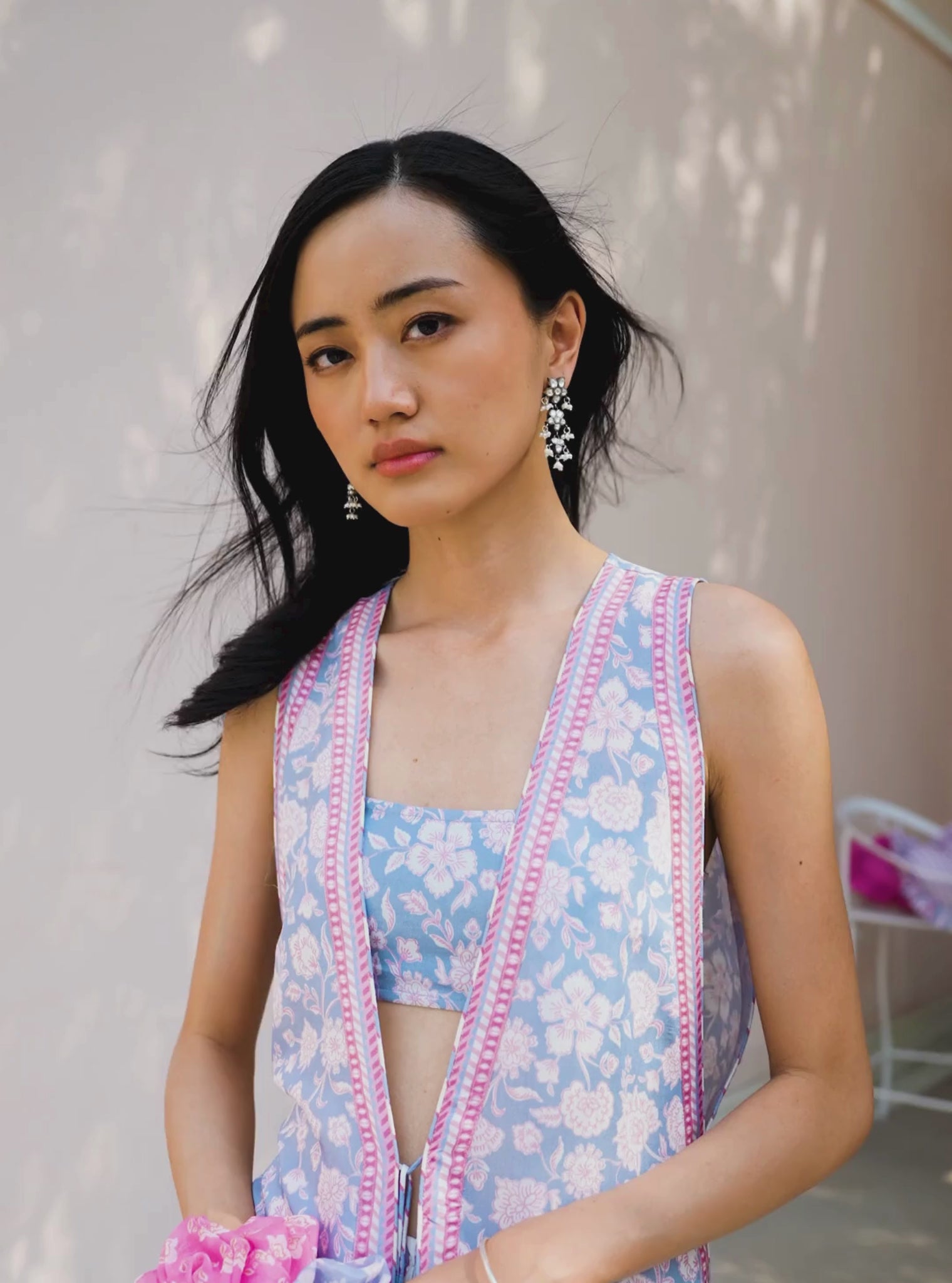The Maharose Jacket Set In Steel Blue Features A Sleeveless Jacket In Printed Lawn With Bold Gadh Motifs, Contrast Geometric Borders, And Delicate Thread And Pearl Tassels That Tie At The Front. The Matching Bustier Mirrors The Same Print, While Wide-Leg Striped Pants Bring In Ease And Movement, Finished With A Contrast Hem. The Jacket’S High Side Slits Add Just The Right Amount Of Structure And Flair.