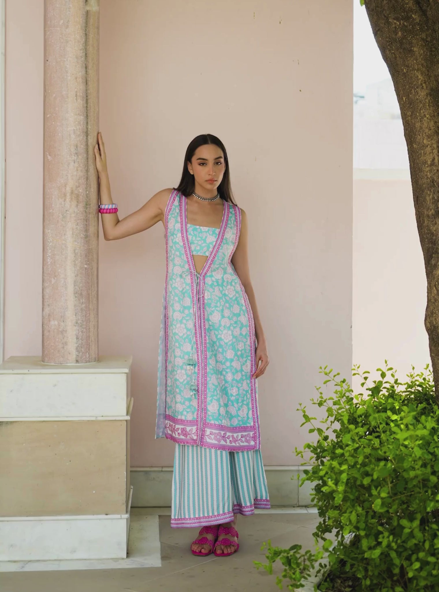 The Maharose Jacket Set In Teal Blue Features A Sleeveless Jacket In Printed Lawn With Bold Gadh Motifs, Contrast Geometric Borders, And Delicate Thread And Pearl Tassels That Tie At The Front. The Matching Bustier Mirrors The Same Print, While Wide-Leg Striped Pants Bring In Ease And Movement, Finished With A Contrast Hem. The Jacket’S High Side Slits Add Just The Right Amount Of Structure And Flair.