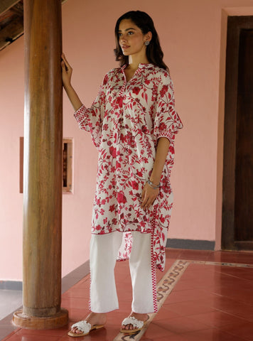 The kurta's relaxed, boxy silhouette offers maximum comfort, while the three-quarter sleeves and open-neck detailing add a hint of modernity. Its lightweight fabric ensures breathability, making it ideal for warmer weather. The straight-leg pants perfectly complement the kurta.