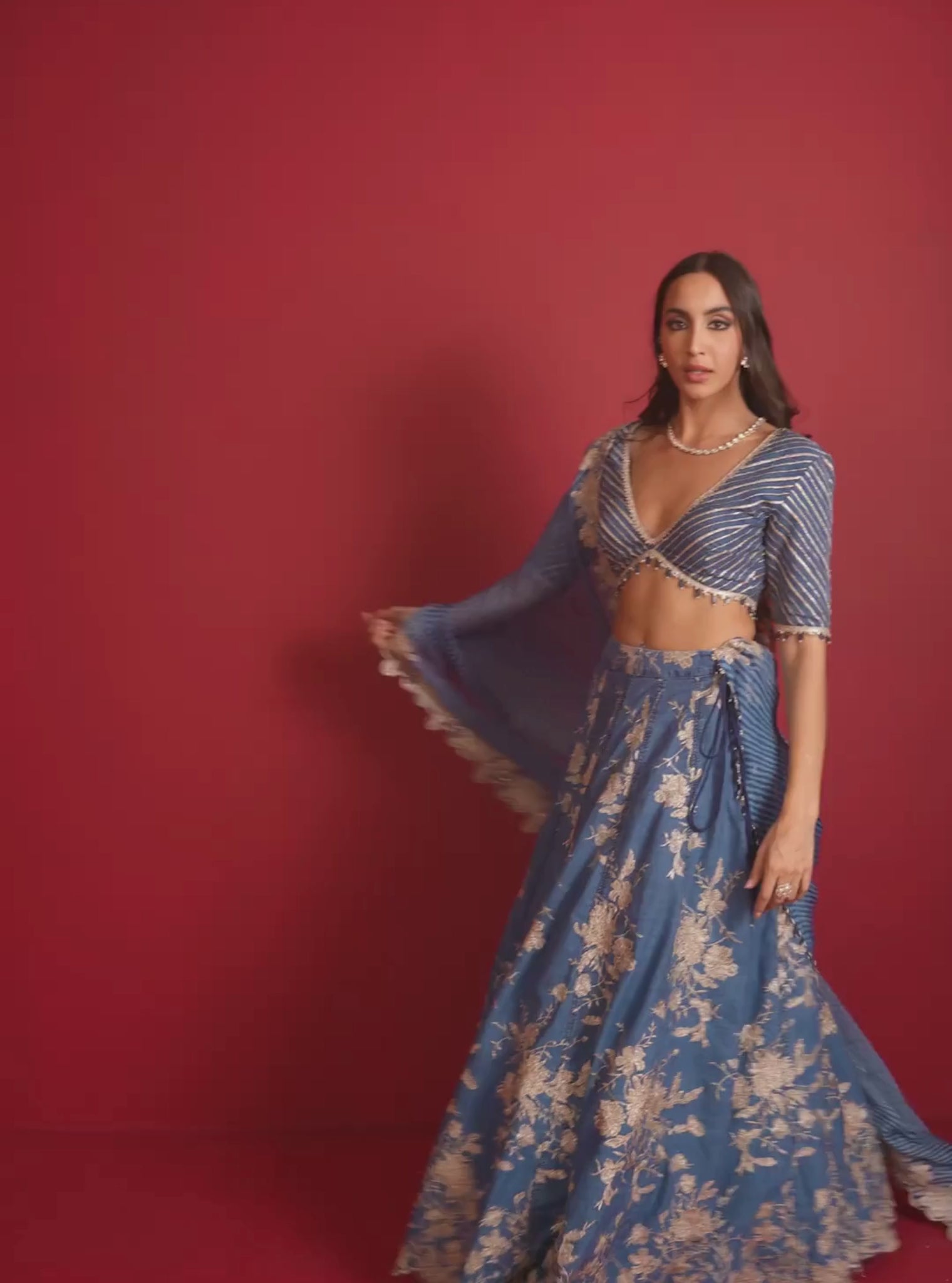 A denim cotton lehenga with matching blouse, detailed with metallic embroidery. Paired with an organza stripe dupatta, it’s a contemporary yet regal choice.