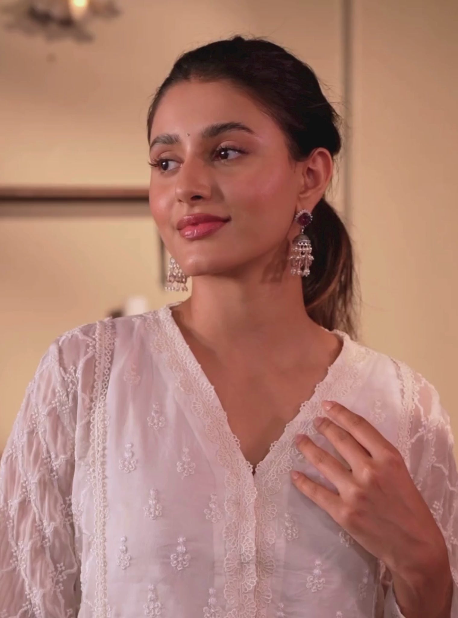 Crafted for the summer season, this sophisticated kurta set exudes timeless charm in pristine white. The straight-cut organza kurta showcases a chic short V-neckline, embellished with intricate lace detailing. Delicate embroidery graces the entirety of the front panel, while the side panels boast exquisite jali work. Adding to its allure, two panels of intricate embellishments adorn the hem, elegantly interspersed with lace accents.