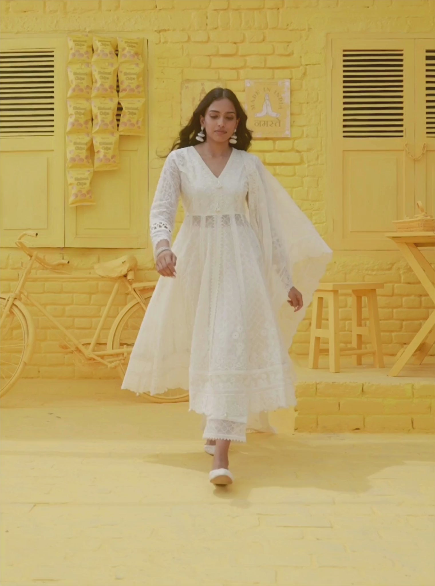 This pristine white kurta set showcases an intricate blend of lace and embroidery. The kurta features a V-neckline, which is elegantly adorned with delicate lacework, extending to the bodice and sleeves. The long, flowing sleeves are highlighted with matching embroidery, adding a touch of grace and charm to the overall design.