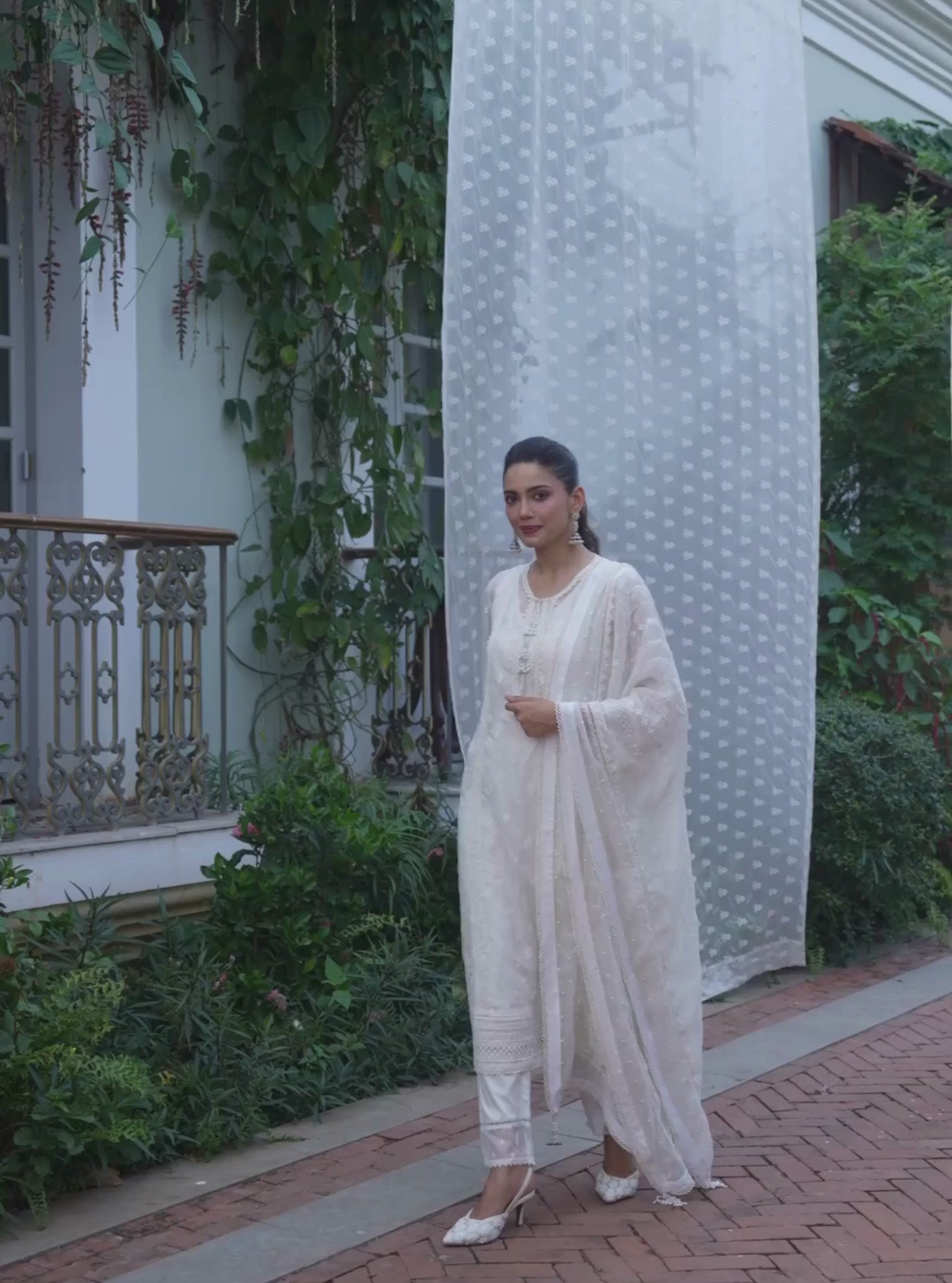 Crafted in lightweight organza, the Koko Kurta Set features a straight kurta with subtle embroidery and refined border detailing. The kurta is paired with fluid satin pants that provide comfort and ease of movement while maintaining a structured silhouette. A coordinated organza dupatta completes the set with a soft, graceful drape.