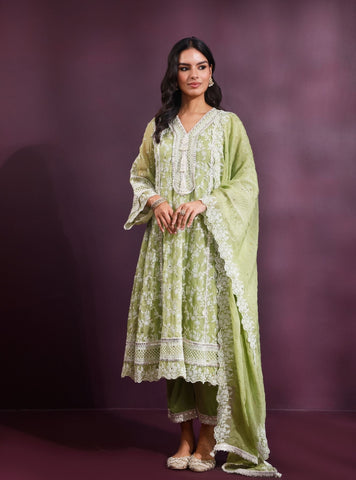The Rupa Anarkali Set In Off White Radiates Timeless Grace. The Organza Kurta Features Fine Embroidery And Lace Detailing That Highlight Its Flared Silhouette. Worn With Pima Satin Pants And A Matching Organza Dupatta, It'S The Perfect Pick For Serene Festivities And Elegant Day Celebrations.