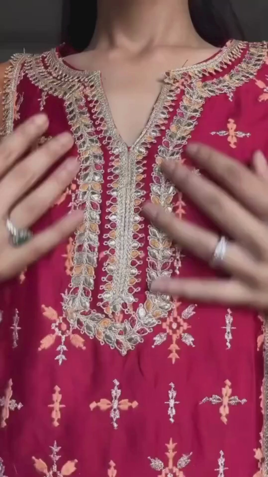 Complete the ensemble with the matching red dupatta with contrasting panels and gotta border.
