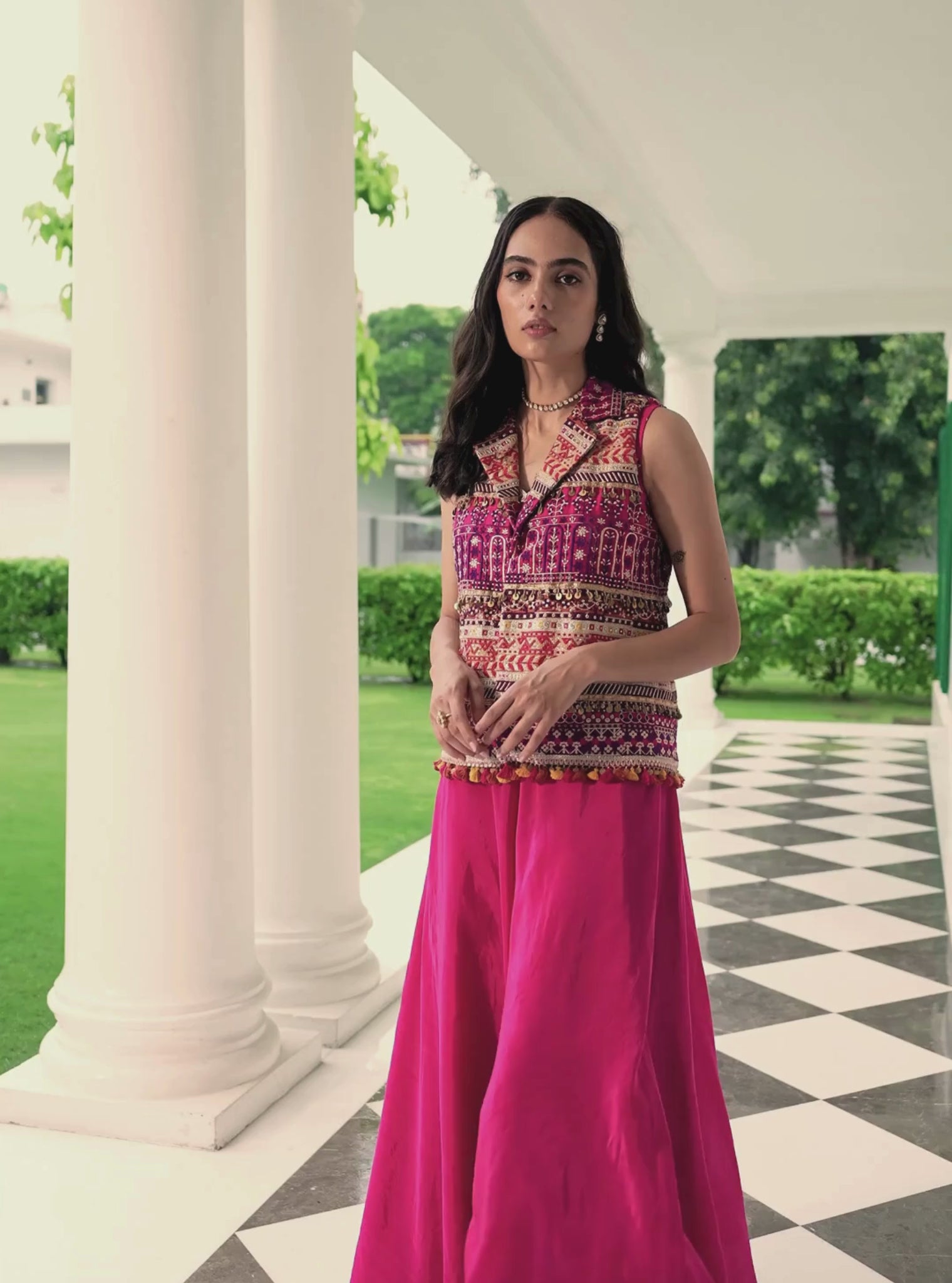 Radiating festive vibrance, this fuschia ensemble is a celebration of bold color and contemporary charm. The sleeveless jacket, crafted in lustrous pima satin, is brought to life with intricate patterns and playful detailing, paired with a matching pima satin blouse. Flowing viscose glass organza luxe shararas add graceful movement, balancing structure with ease.
