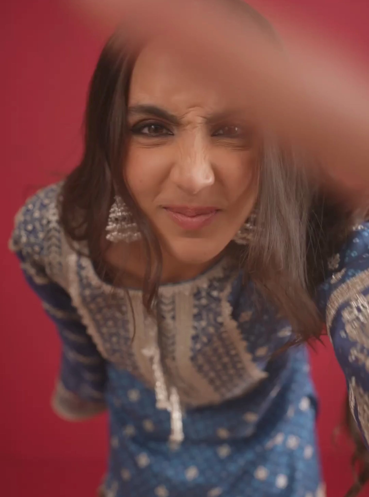 A classic navy printed kurta in smooth pima satin, styled with tonal pants for a streamlined silhouette. Paired with a sheer organza dupatta, this set is equal parts refined and versatile for festive dressing.