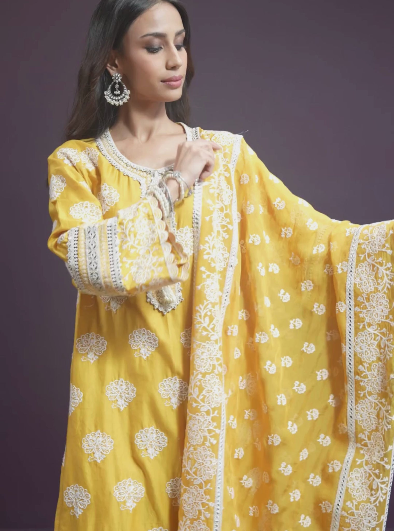 A sunshine favourite — the Reha Kurta Set in Mustard is crafted in luxurious Pima Satin for a smooth, airy feel. The straight silhouette features floral motifs and tonal embroidery, balanced by tailored pants. A sheer Organza Dupatta with intricate lace edges completes the ensemble, perfect for daytime festivities and casual elegance.