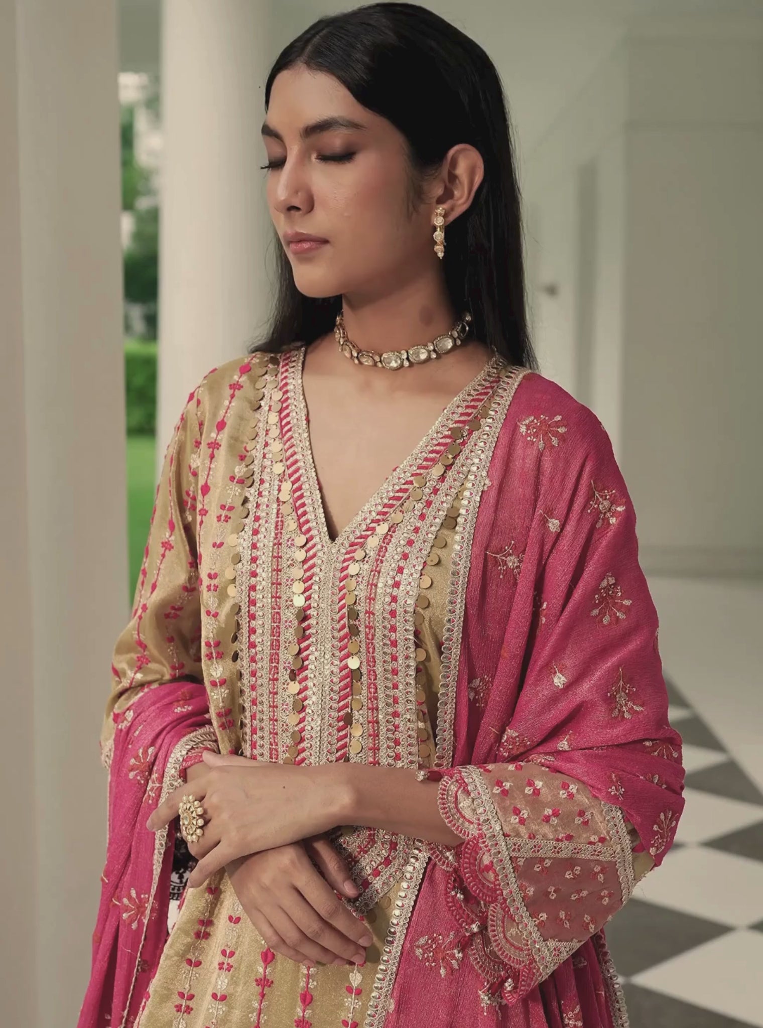 A striking play of soft pastels and vivid contrast, this kurta set is designed to turn heads at any celebration. The straight-cut pista green kurta, crafted from luxurious tissue fabric, shimmers with a subtle sheen that catches the light with every movement. Paired with fuschia lurex-insert pants, the ensemble strikes the perfect balance between elegance and vibrancy. The matching fuschia lurex-insert Varadaa dupatta drapes effortlessly, adding texture and depth to the look. Ideal for festive luncheons, wedding functions, or cultural gatherings, this set blends contemporary color play with timeless sophistication.