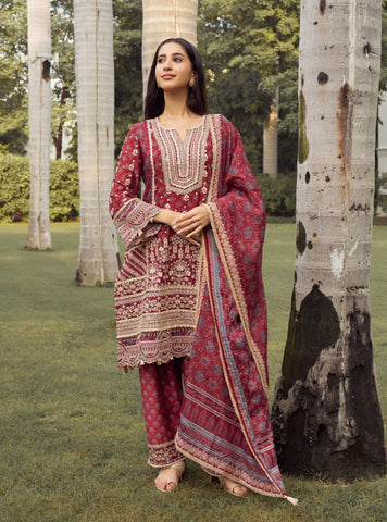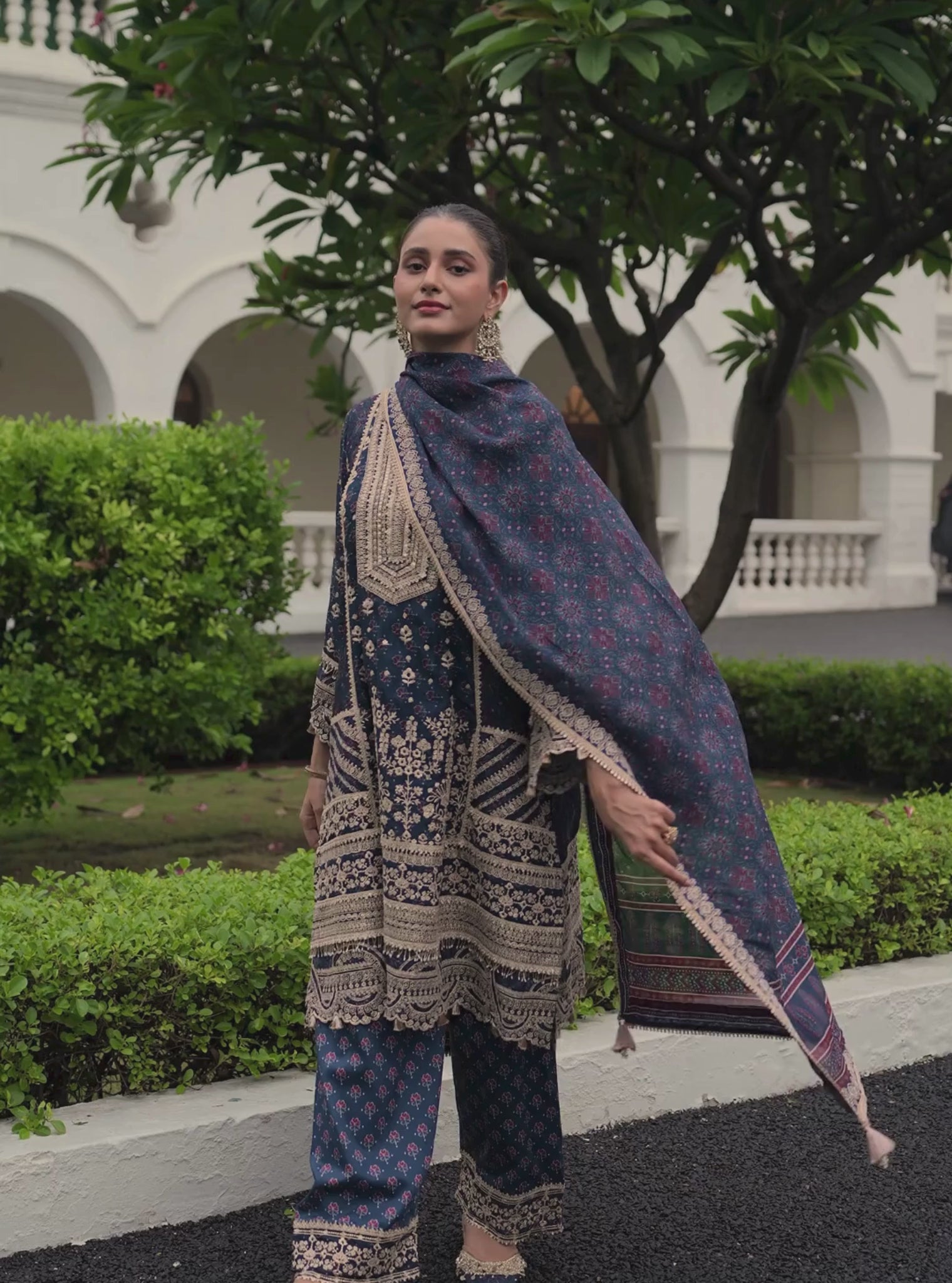 A navy Ajrakh-printed kurta set crafted in luxe viscose glass organza, designed with an ornate embroidered yoke and scalloped lace-look borders. The kurta falls softly with a graceful flare, paired with matching Ajrakh-printed Pima satin pants. Finished with a coordinated organza dupatta, this set blends artisanal craft with an elevated, winter-festive feel.